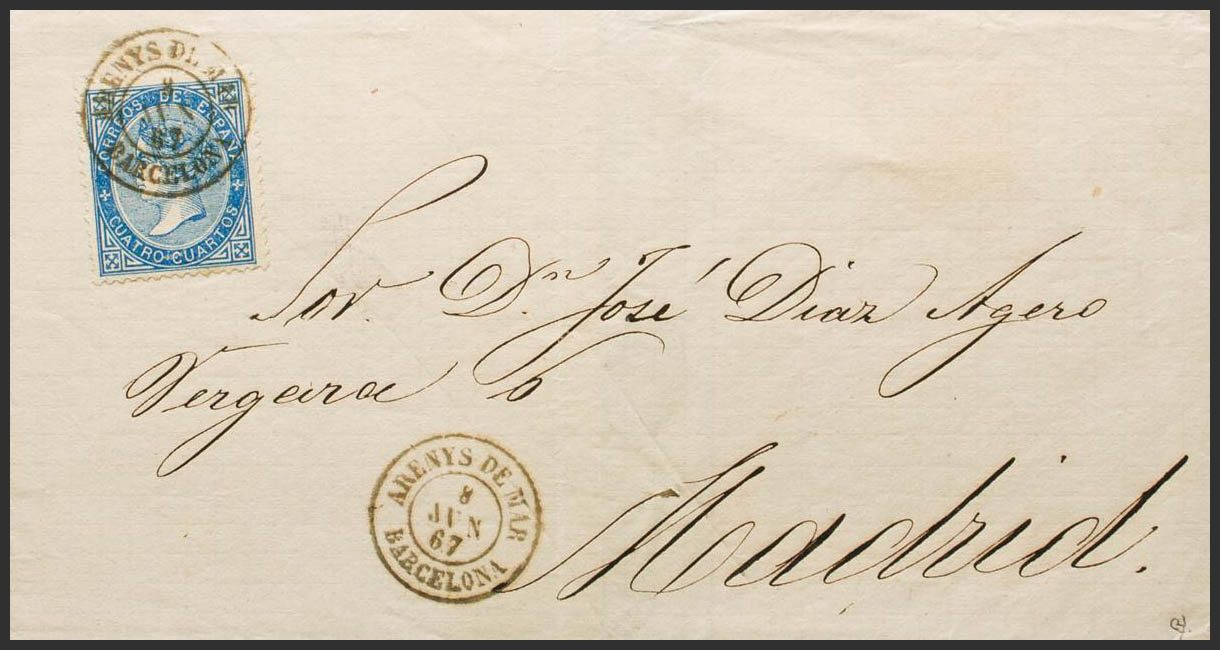88. 1866. 4 cuartos blue. ARENYS DE MAR to MADRID. Postmark ARENYS DE MAR / CATALONIA. MAGNIFICENT. Ex-Blight.