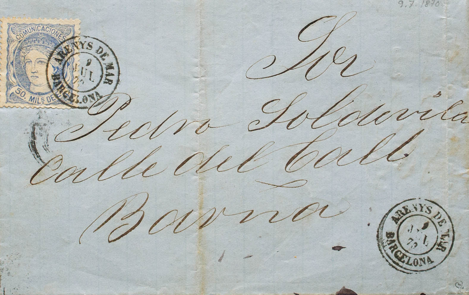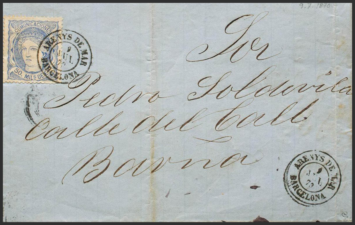 107. 1870. 50 mils overseas. ARENYS DE MAR to BARCELONA. Postmark ARENYS DE MAR / BARCELONA. MAGNIFICENT AND RARE. Ex-Blight.
