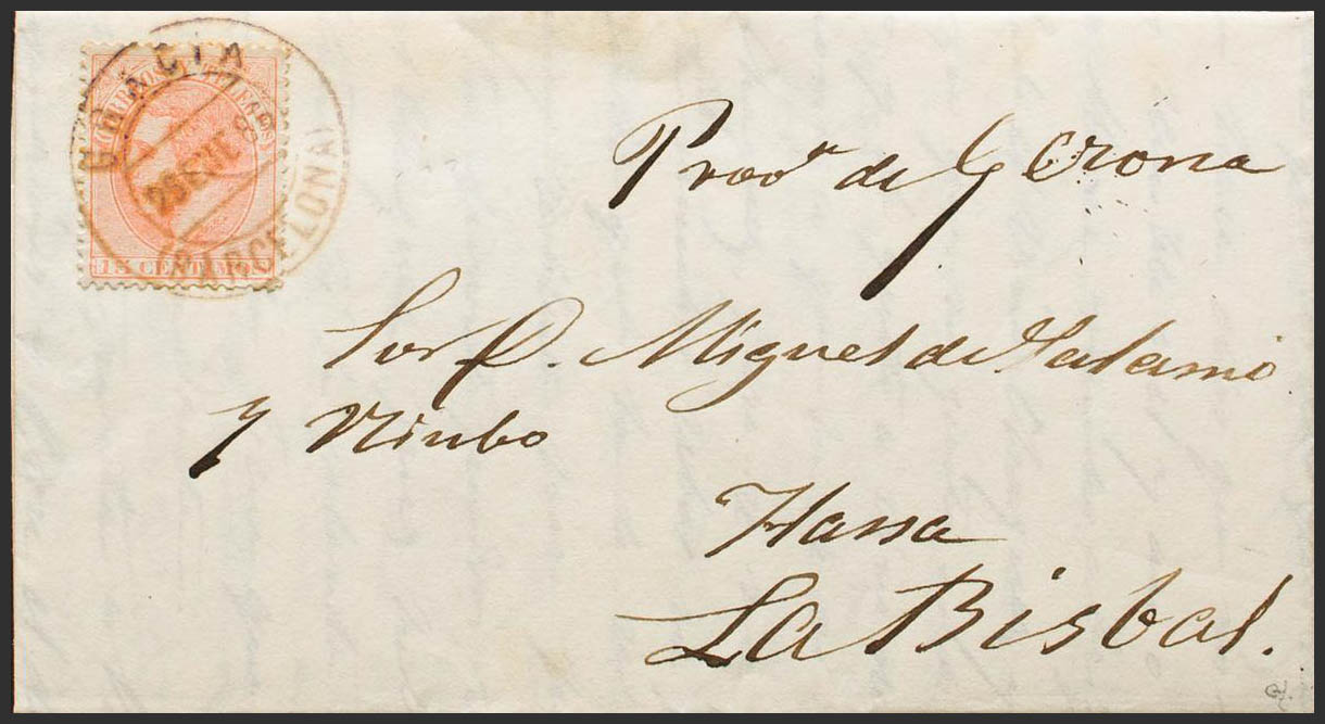 210. 1886. 15 orange cts. THANKS to LA BISBAL. Postmark GRACIA / (BARCELONA), in blue. MAGNIFICENT AND VERY RARE, FIRST KNOWN DATE OF THIS ADMINISTRATION. Ex-Blight.