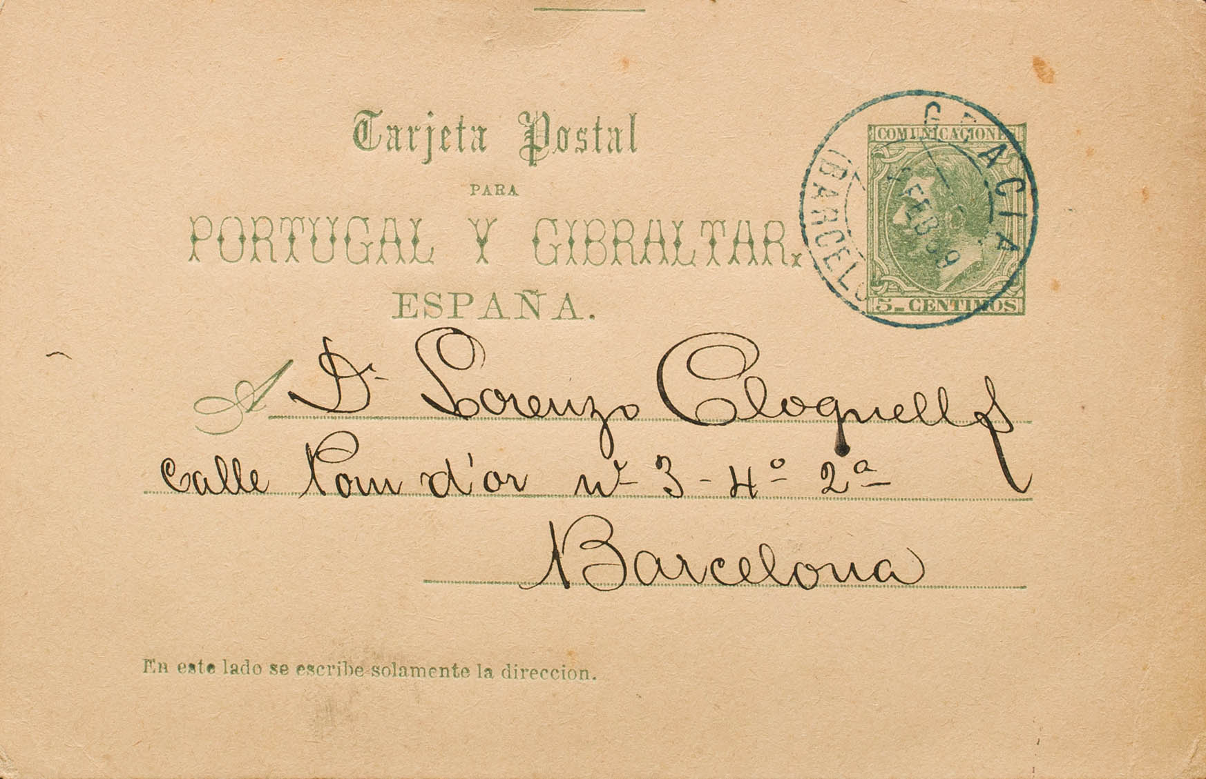 EP13. 1889. 5 cts green on Postal Entire Card. GRACE to BARCELONA. Postmark GRACIA / (BARCELONA), in blue. MAGNIFICENT AND RARE. Ex-Blight.