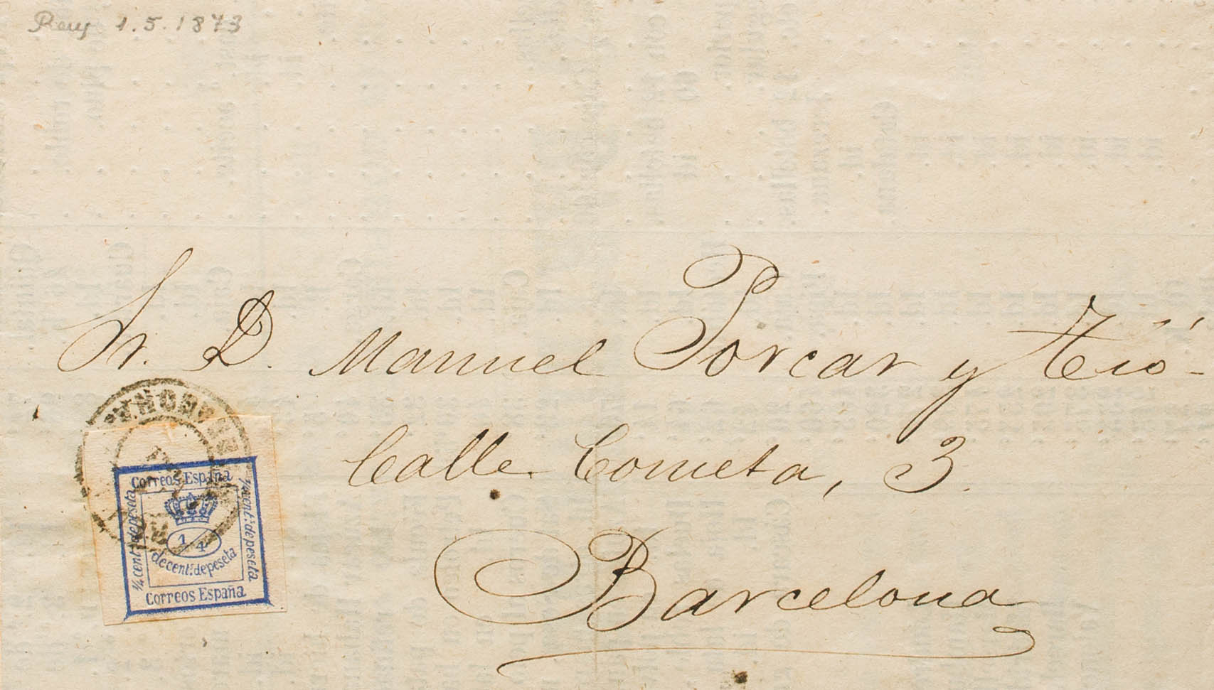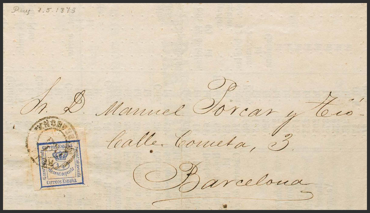 115. 1873. ¼ cts overseas. Printed from REUS to BARCELONA. Postmark REUS / BARCELONA. MAGNIFICENT AND RARE. Ex-Blight.