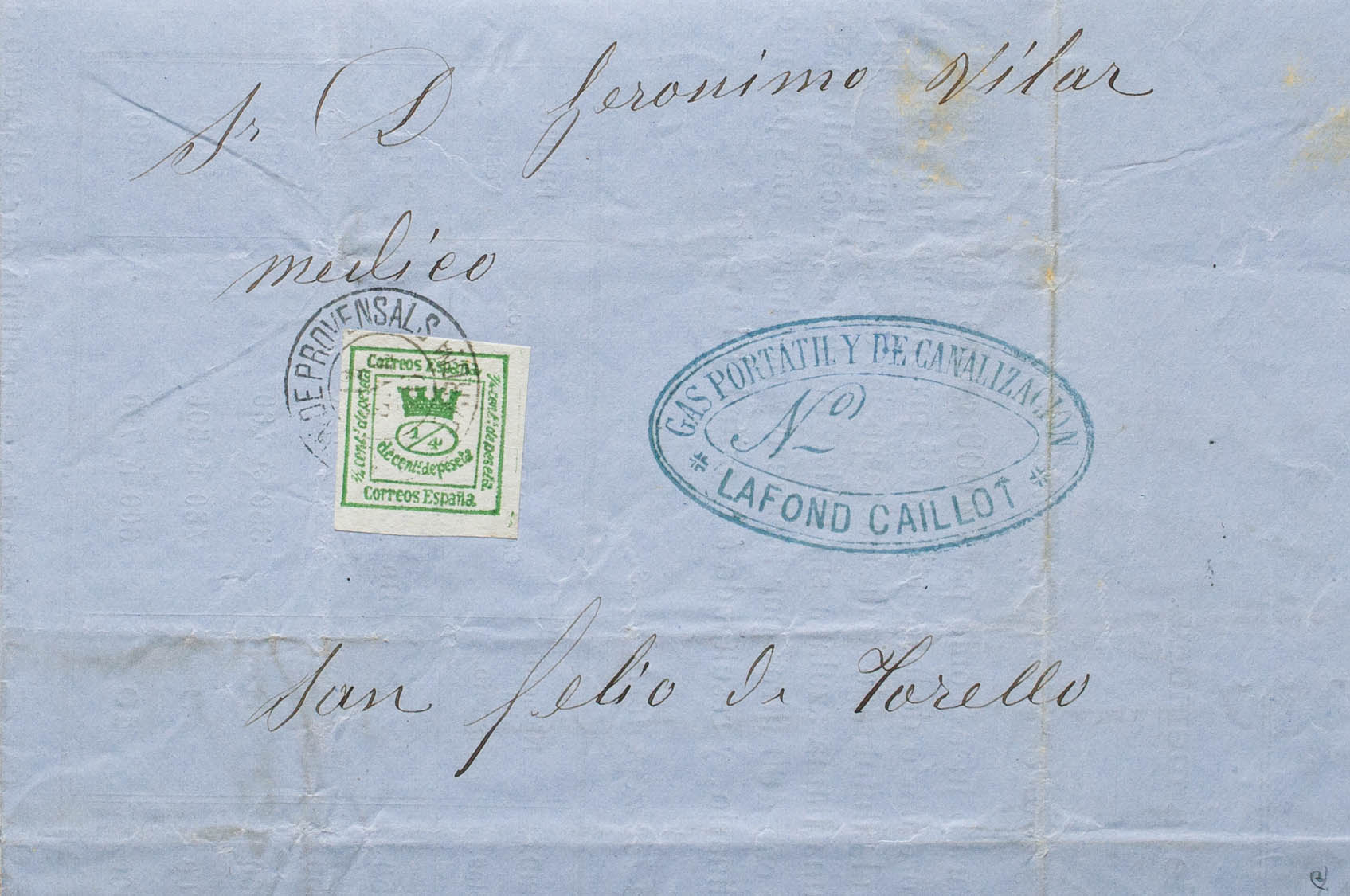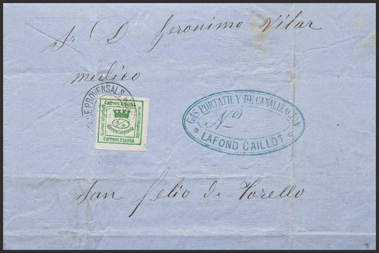 130. 1876. ¼ cts green. Printed from SAN MARTIN DE PROVENSALS to SAN FELIU DE TORELLO. Postmark S. MARTIN DE PROVENSALS / BARNA. MAGNIFICENT AND RARE. Ex-Blight.