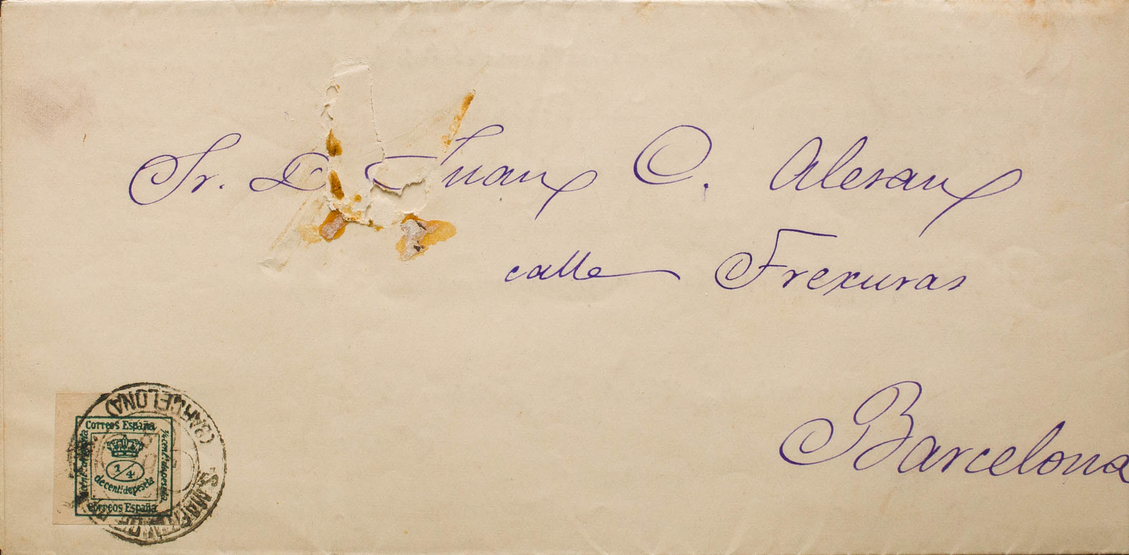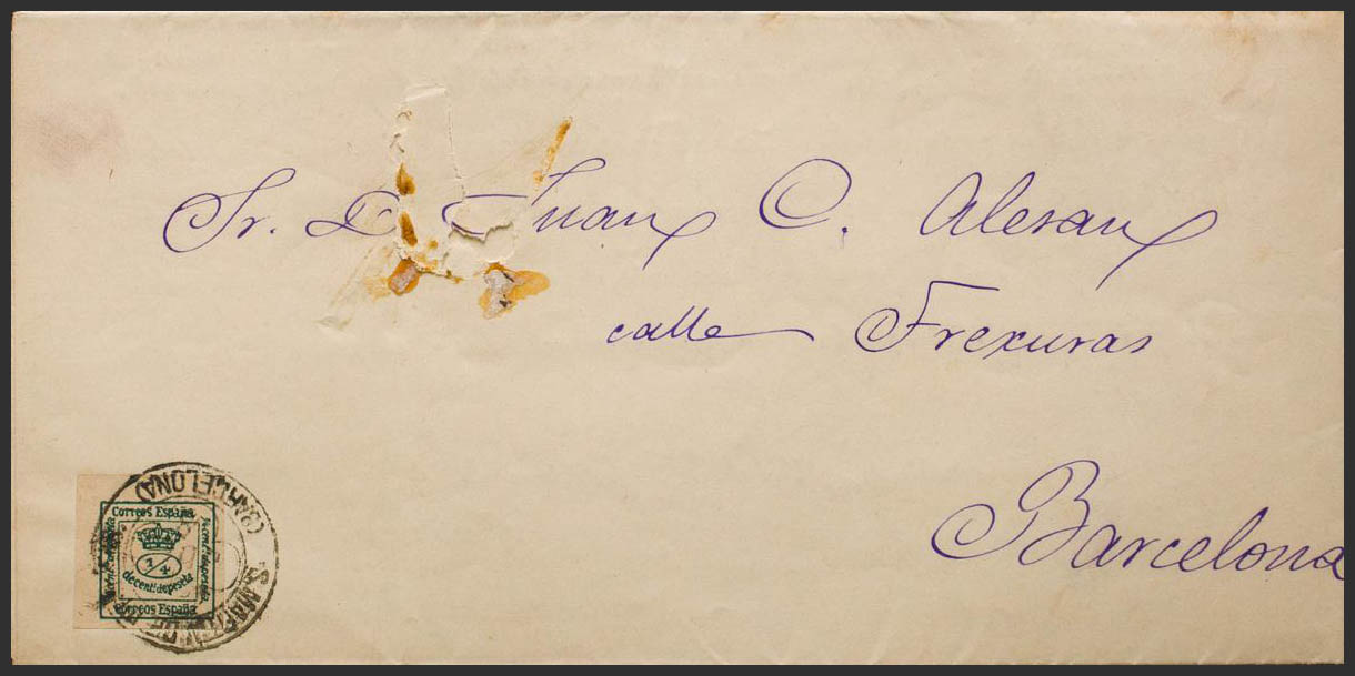 173. 1888. ¼ cts green. Printed from SAN MARTIN DE PROVENSALS to BARCELONA (erosion on the part of the address). Clover postmark S. MARTIN DE PROVENS. / (BARCELONA). MAGNIFICENT AND RARE. Ex-Blight.
