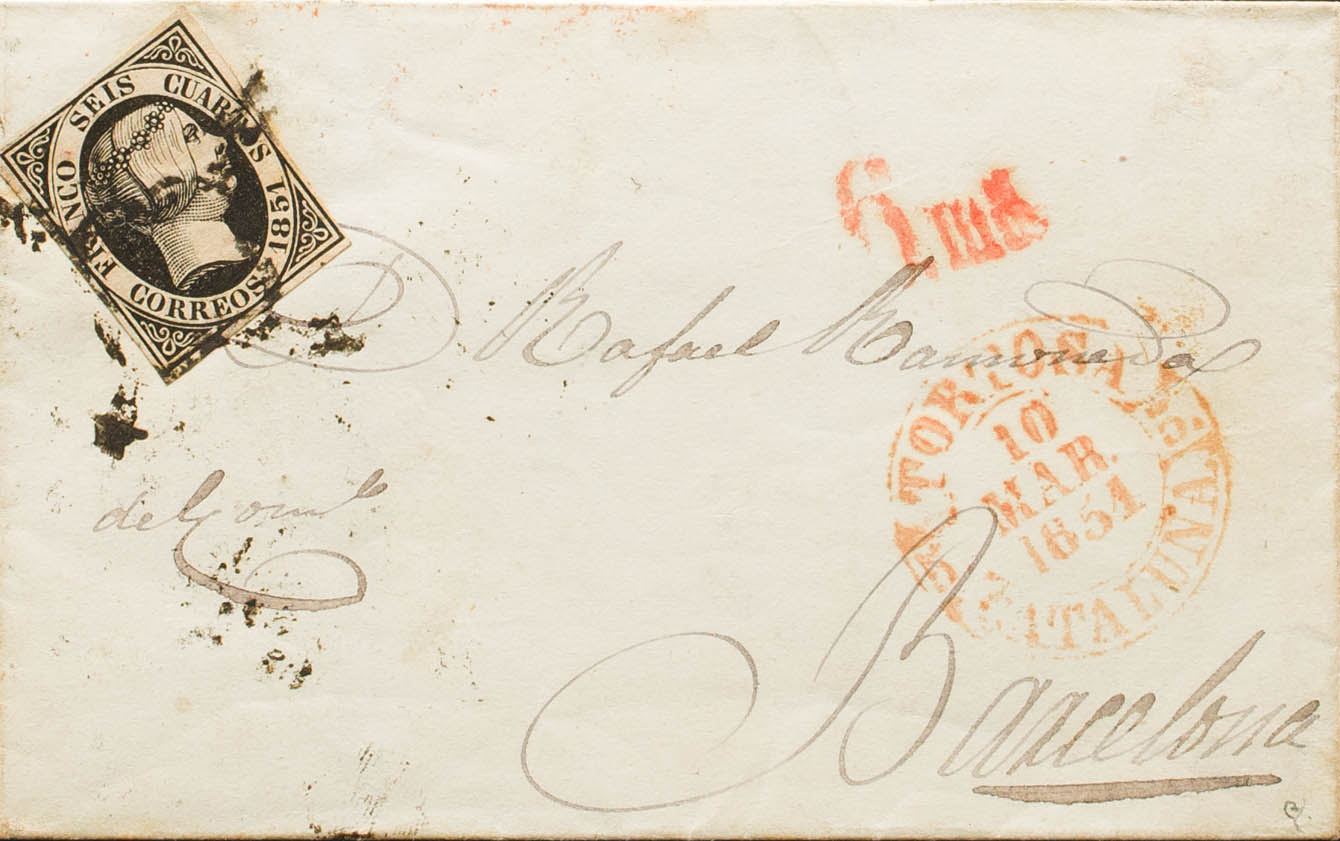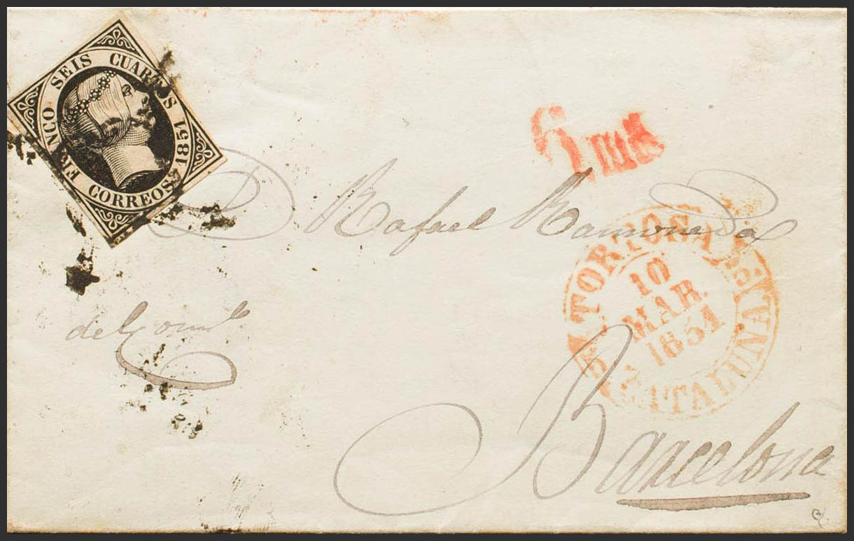 6. 1851. 6 cuartos black. TORTOSA to BARCELONA. In the front baeza TORTOSA / CATALONIA. MAGNIFICENT. Ex-Blight.