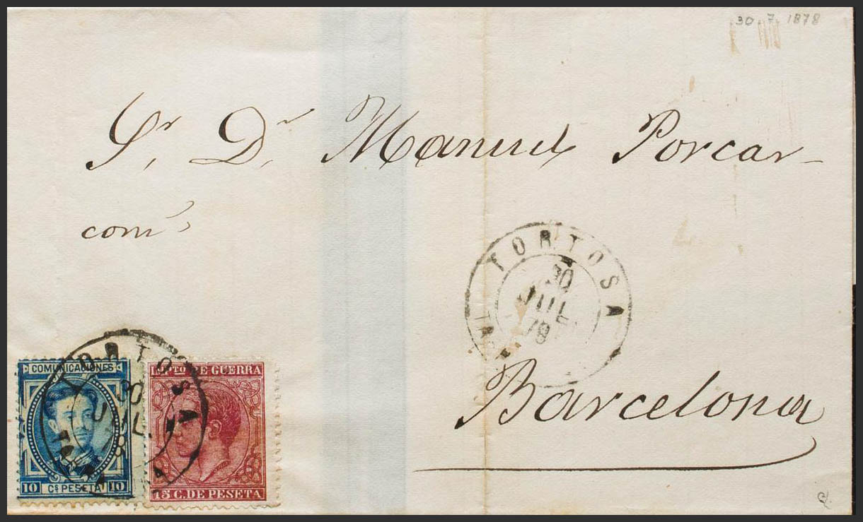 175, 188. 1879. 10 cts blue and 15 cts carmine. TORTOSA to BARCELONA. Clover postmark TORTOSA / TARRAGONA. MAGNIFICENT AND RARE 10 CTS CIRCULATED OUT OF USE. Ex-Blight.