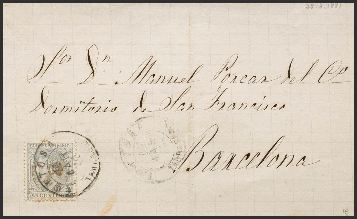 204. 1881. 25 gray cts. TORTOSA to BARCELONA. Postmark TORTOSA / TARRAGONA. MAGNIFICENT. Ex-Blight.