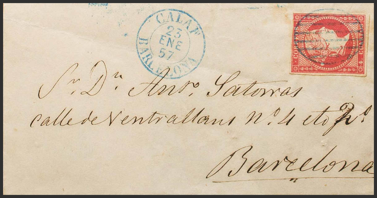 48. 1857. 4 red cuartos . CALAF to BARCELONA. Postmark GRILL (Type I), in blue. MAGNIFICENT. Ex-Blight.