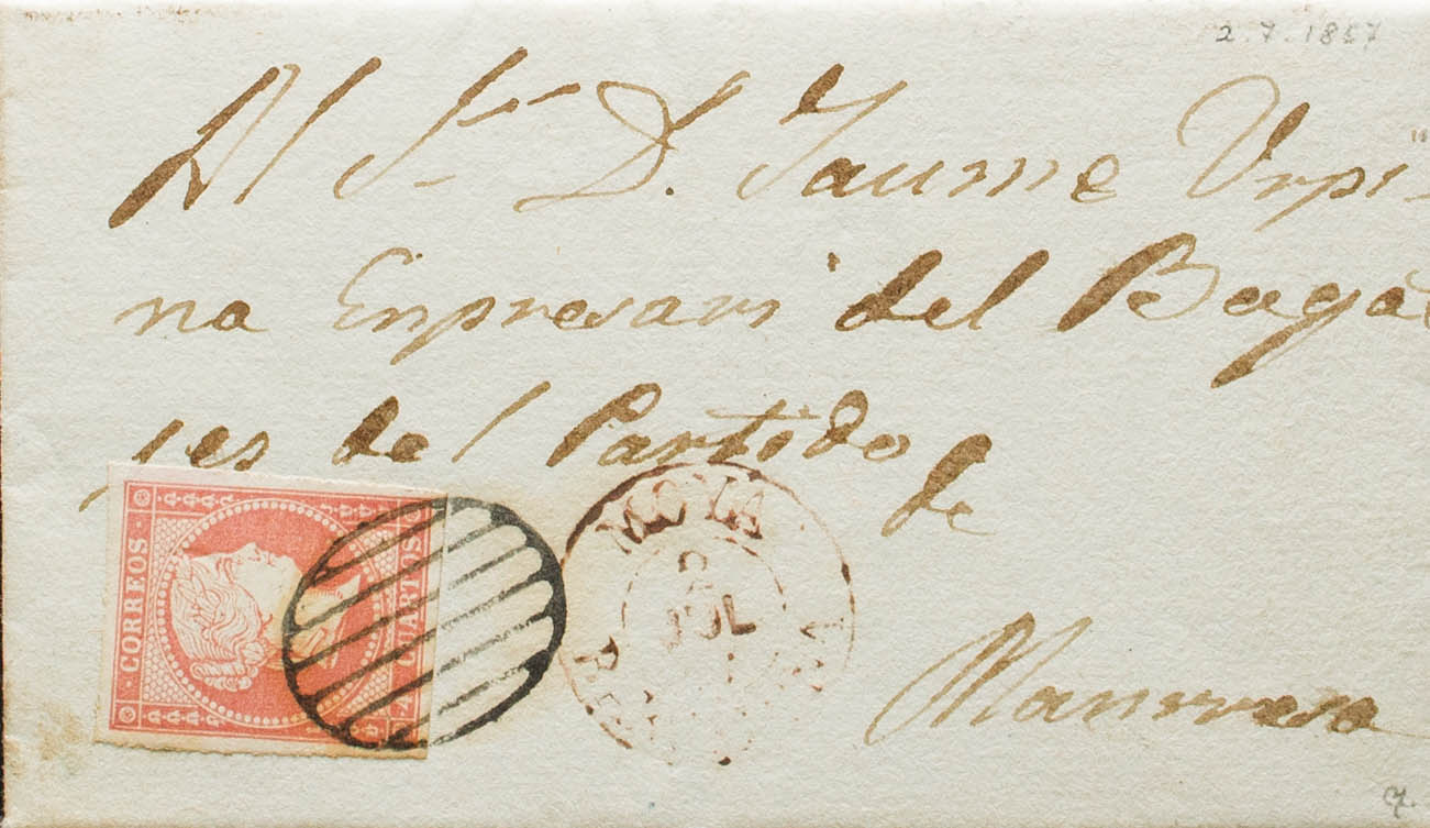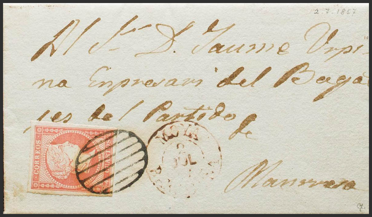 48. 1857. 4 red cuartos . MOYA to MANRESA. Postmark PARRILLA, in writing ink and on the front date stamp MOYA / BARCELONA (Type I). MAGNIFICENT. Ex-Blight.