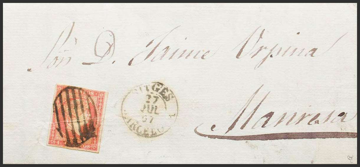 48. 1857. 4 red cuartos . SITGES to MANRESA. SITGES / BARCELONA (Type I) dater on the front. MAGNIFICENT. Ex-Blight.