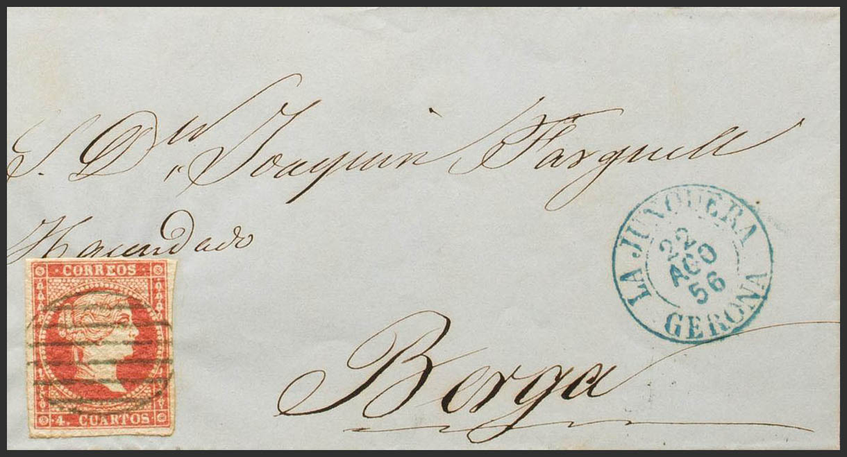 44. 1856. 4 red cuartos . LA JUNQUERA to BERGA. Postmark GRILL, in blue and on the front date stamp LA JUNQUERA / GERONA (Type I), in blue. MAGNIFICENT. Ex-Blight.