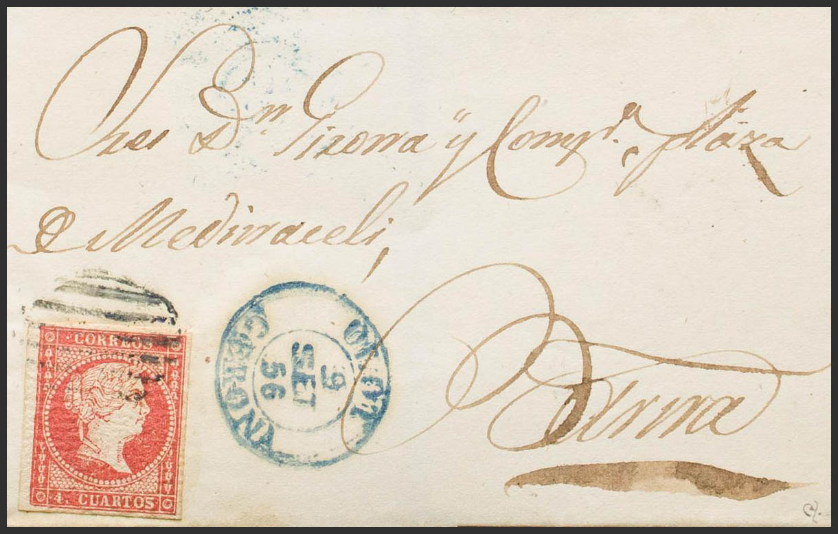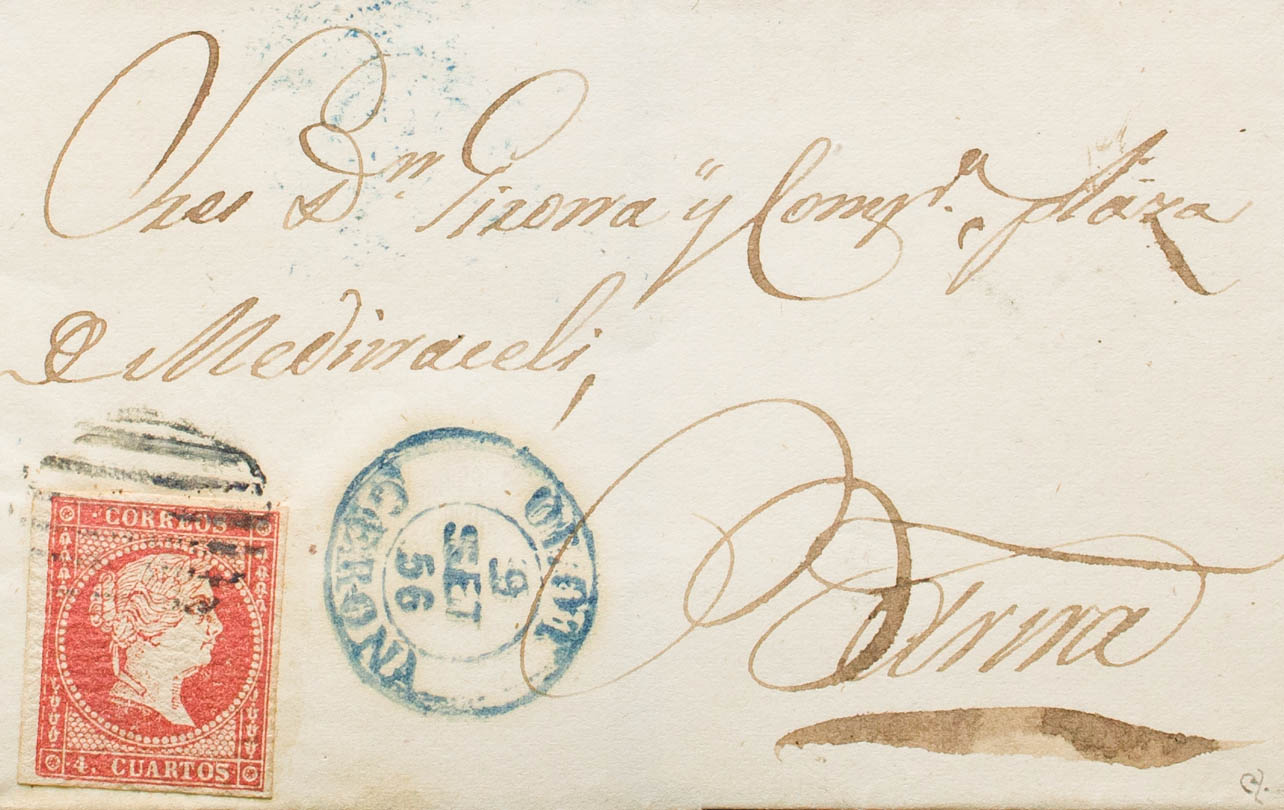 44. 1856. 4 red cuartos . OLOT to BARCELONA. On the front dater OLOT / GERONA (Type I), in blue. MAGNIFICENT. Ex-Blight.