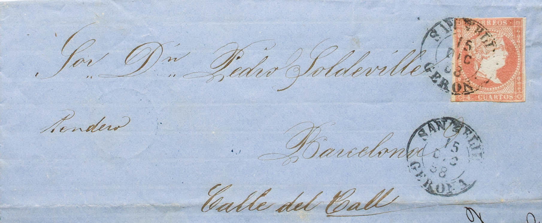 48. 1858. 4 red cuartos . SAN FELIU DE GUIXOLS to BARCELONA. Postmark SAN FELIU / GERONA (Type I). MAGNIFICENT AND RARE. Ex-Blight.