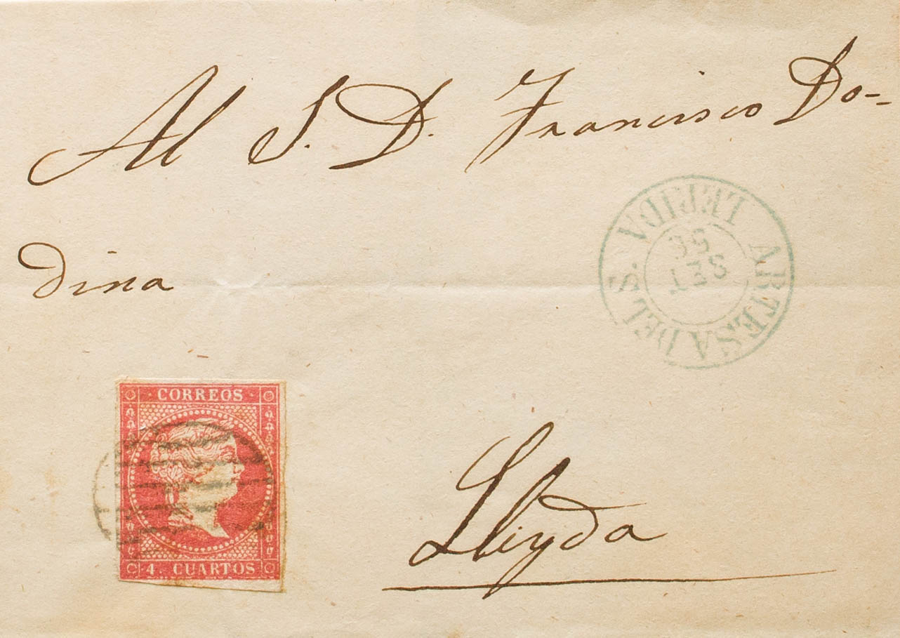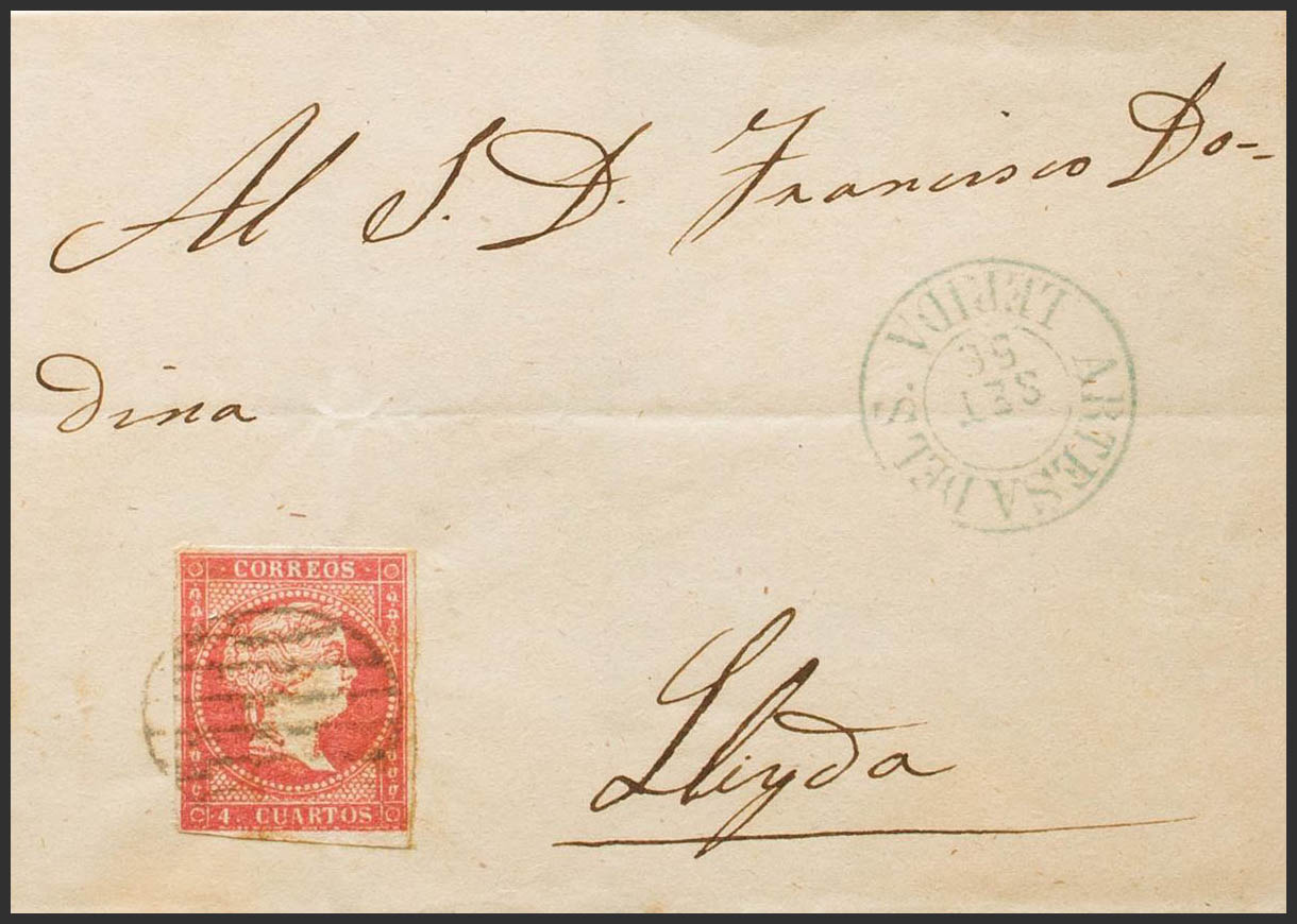 48. 1856. 4 red cuartos . ARTESA DE SEGRE to LERIDA. On the front dater ARTESA DEL S. / LERIDA (Type I). MAGNIFICENT. Ex-Blight.