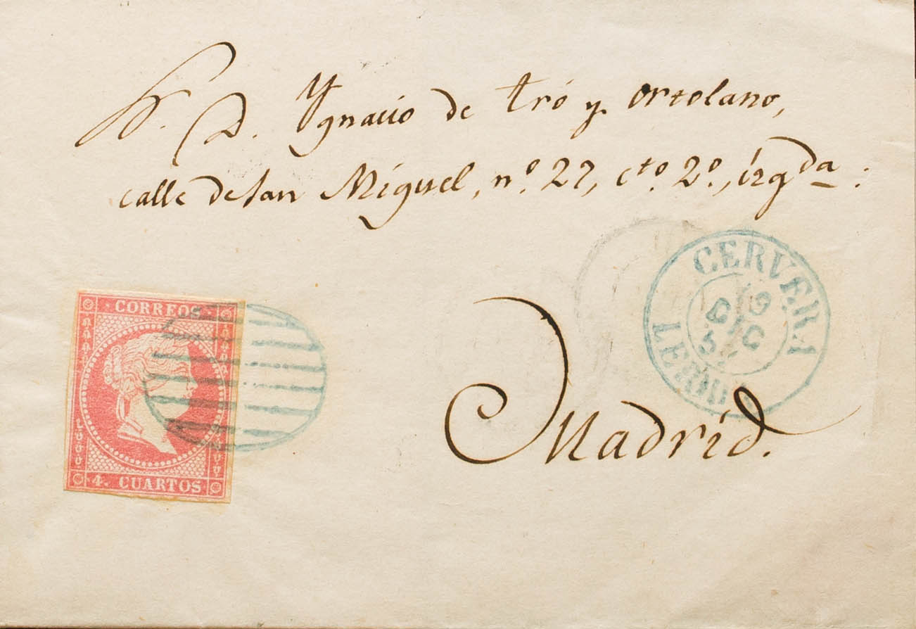 48. 1857. 4 red cuartos . CERVERA to MADRID. Postmark GRILL, in blue and CERVERA / LERIDA (Type I) date stamp on the front, in blue. MAGNIFICENT. Ex-Blight.