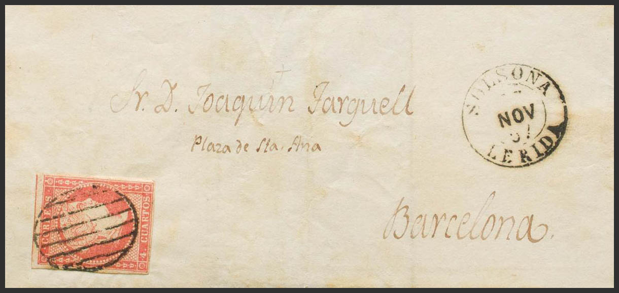 48. 1857. 4 red cuartos . SOLSONA to BARCELONA. On the front date SOLSONA / LERIDA (Type I). MAGNIFICENT. Ex-Blight.
