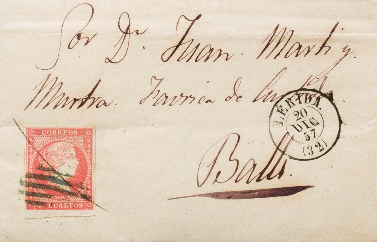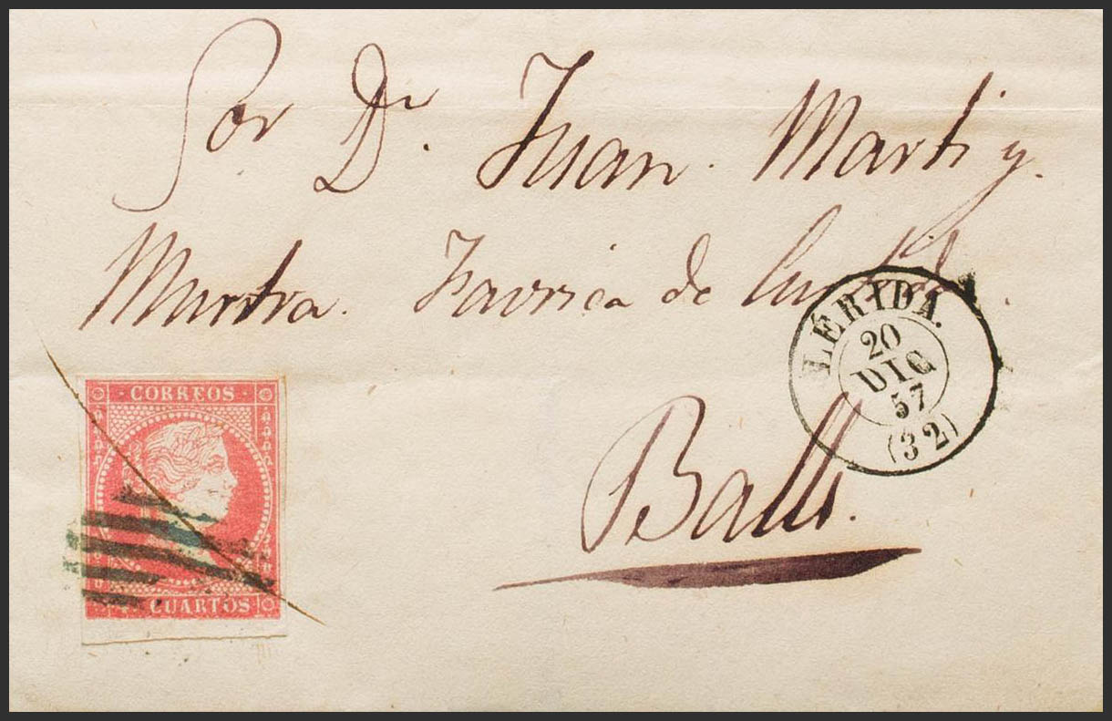 48. 1857. 4 red cuartos . LERIDA to VALLS. GRILL postmark and pen stroke, on the front dater LERIDA / (32). MAGNIFICENT. Ex-Blight.