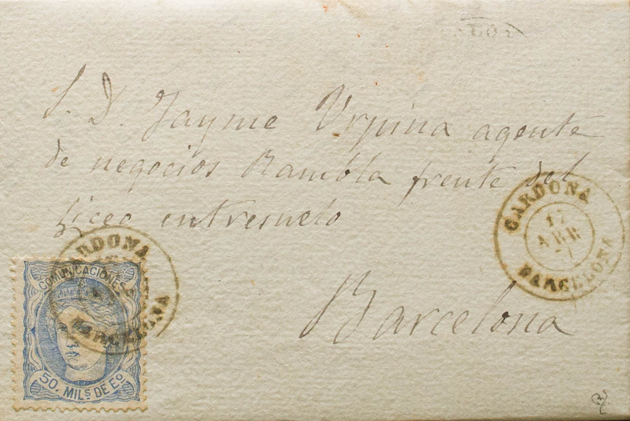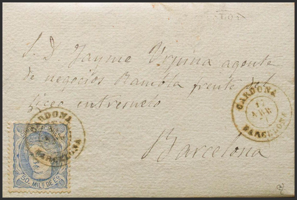 107. 1871. 50 mils overseas. CARDONA to BARCELONA. Postmark CARDONA / BARCELONA. MAGNIFICENT AND RARE. Ex-Blight.