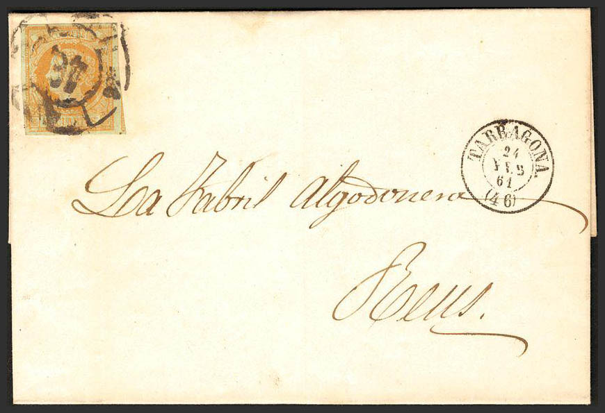 52. 1860. 4 cuartos yellow. TARRAGONA to REUS. Postmark R. CARRETA Nº 46.