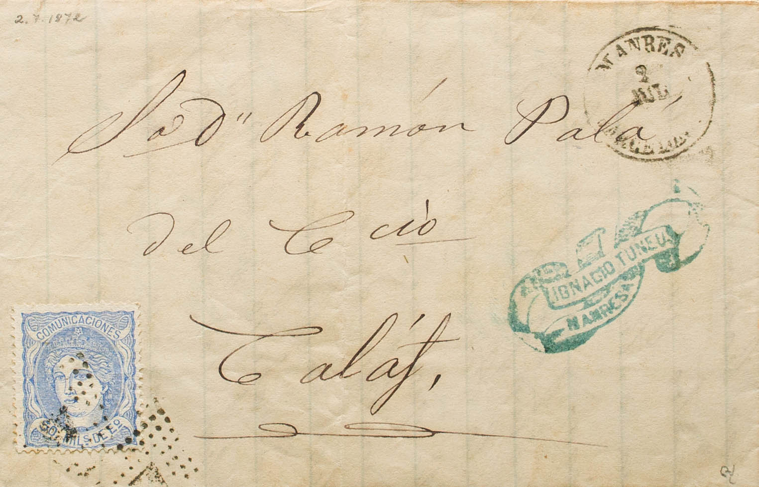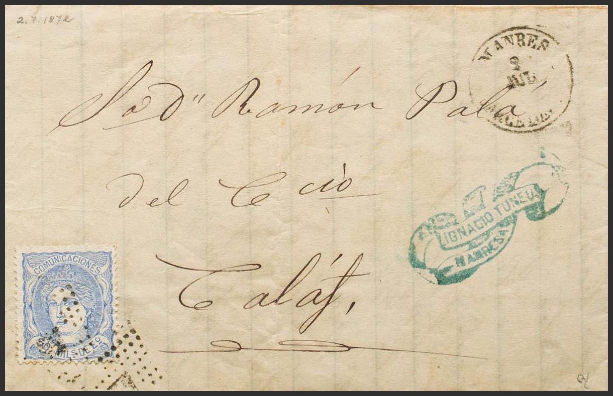 107. 1872. 50 mils overseas. MANRESA to CALAF. MAGNIFICENT. Ex-Blight.