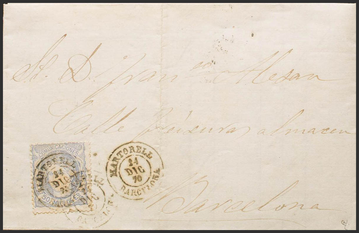 107. 1870. 50 mils overseas. ASPARAGUS to BARCELONA. Postmark MARTORELL / BARCELONA. MAGNIFICENT AND RARE. Ex-Blight.