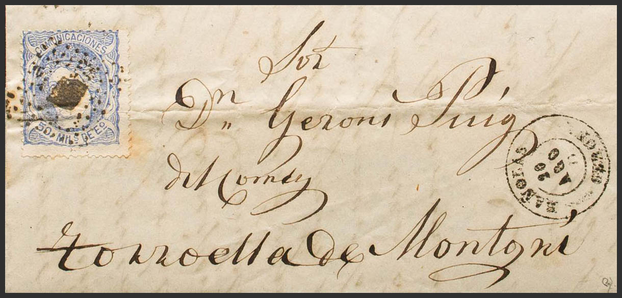 107. 1871. 50 mils overseas (file fold). BAÑOLAS to TORROELLA DE MONTGRI. On the front dater BAÑOLAS / GERONA. MAGNIFICENT. Ex-Blight.