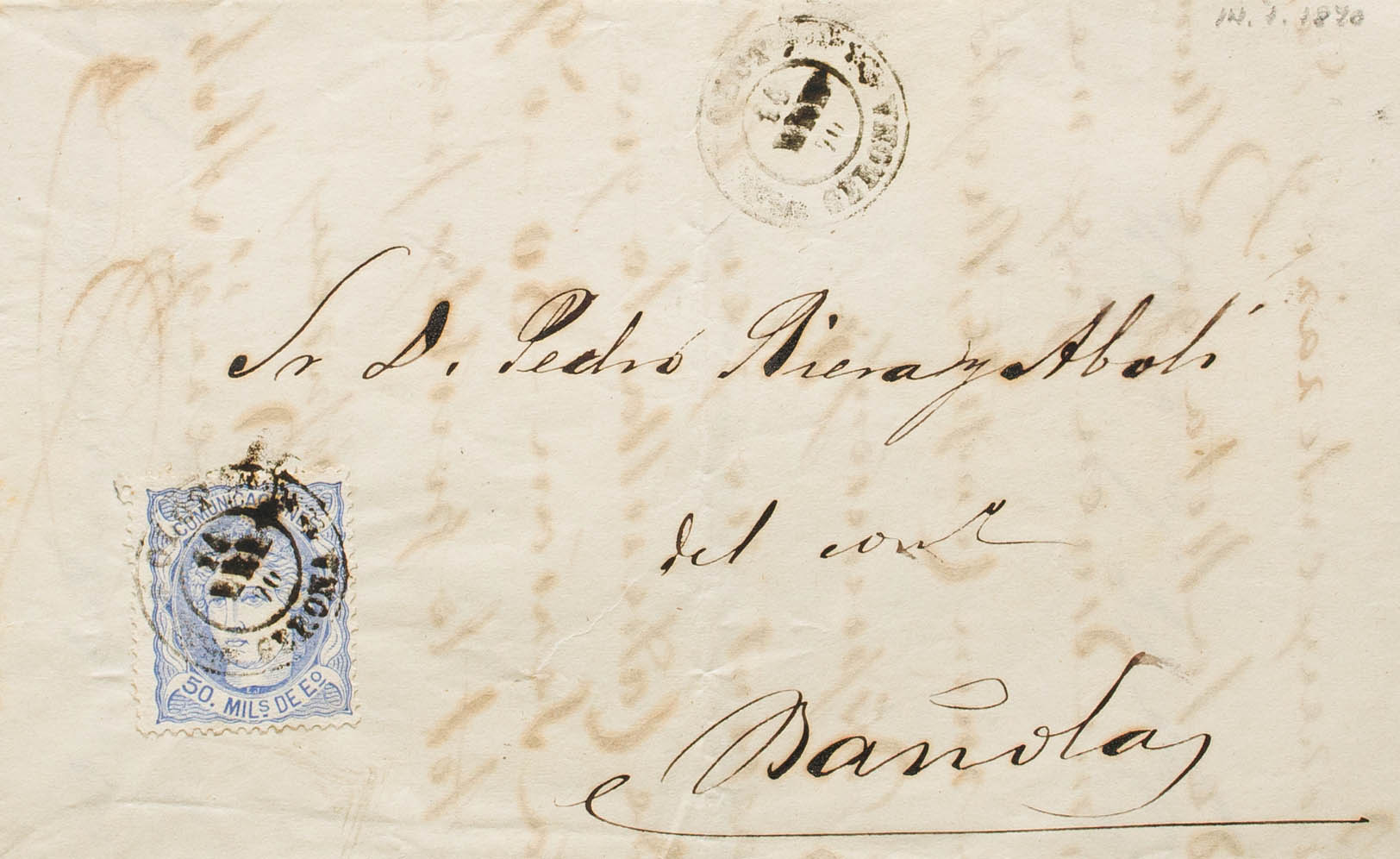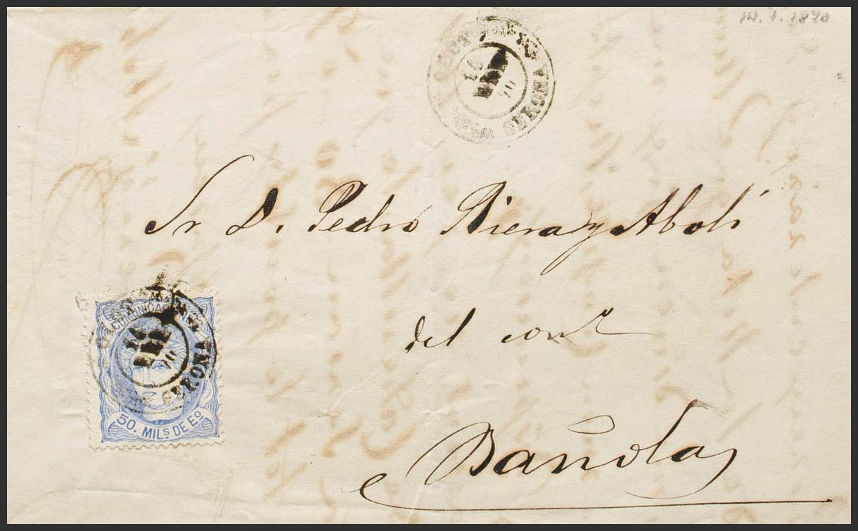 107. 1870. 50 mils overseas. OLOT to BAÑOLAS. Postmark OLOT / GERONA. MAGNIFICENT. Ex-Blight.