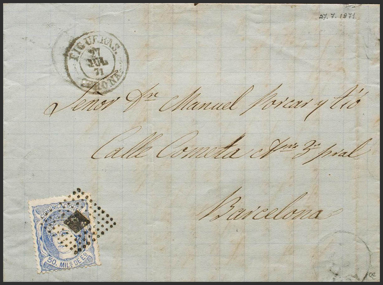 107. 1871. 50 mils overseas. FIGUERAS to BARCELONA. On the front dater FIGUERAS / GERONA. MAGNIFICENT. Ex-Blight.