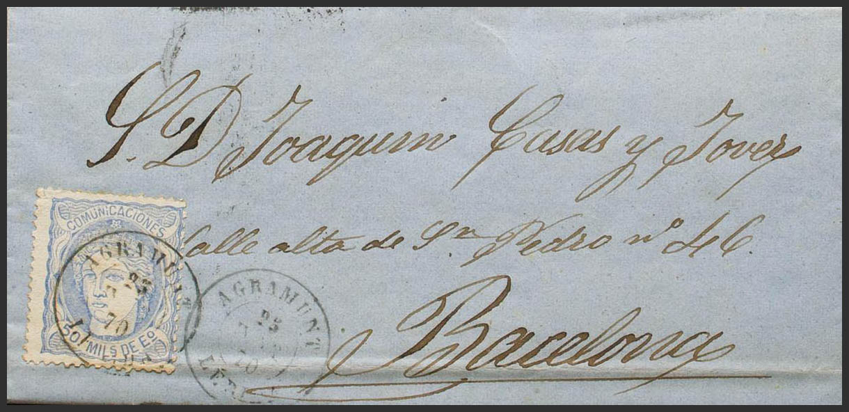 107. 1870. 50 mils overseas. AGRAMUNT to BARCELONA. Postmark AGRAMUNT / LERIDA. MAGNIFICENT AND RARE. Ex-Blight.