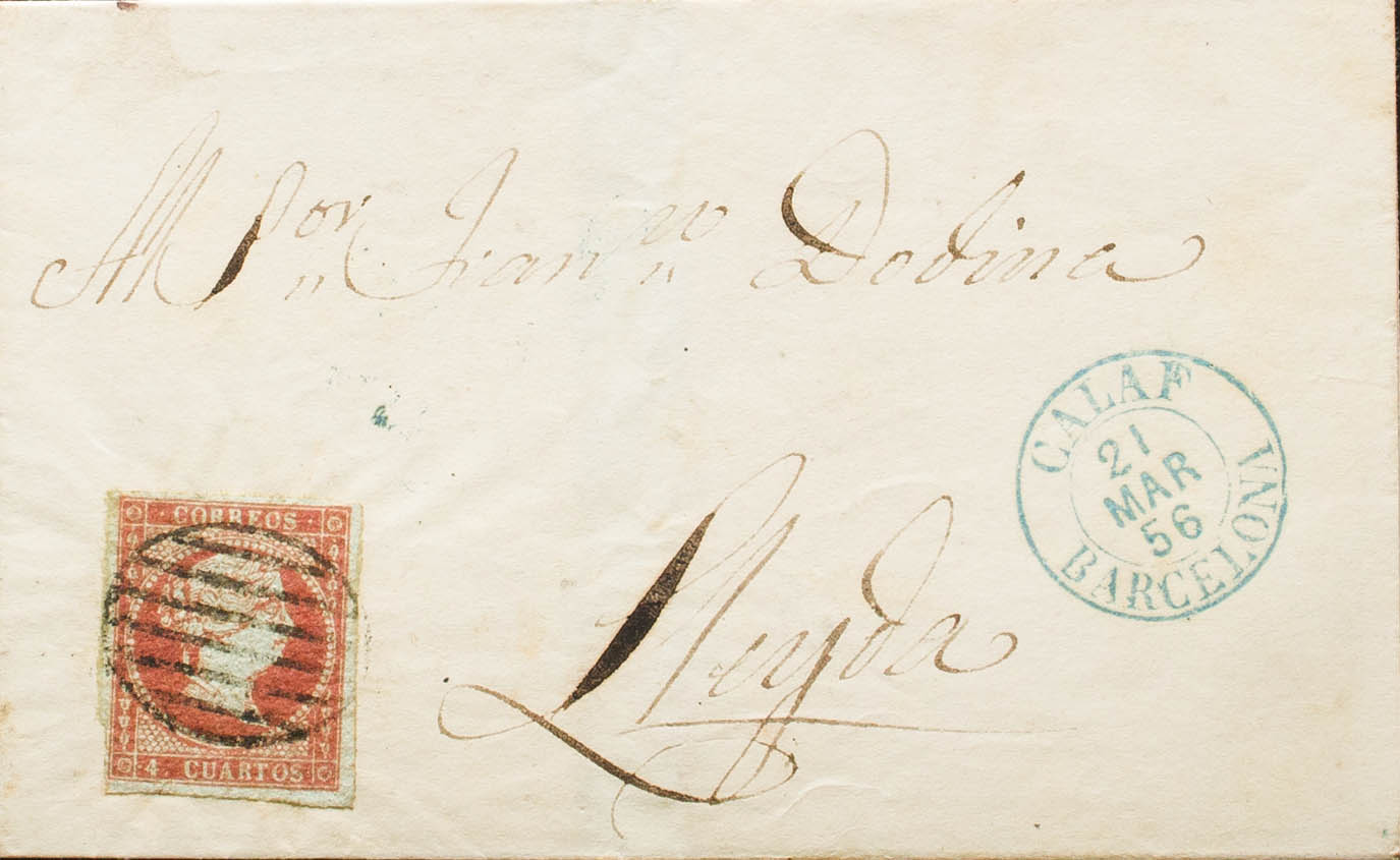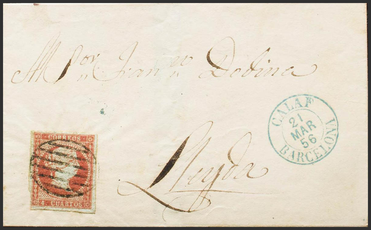 40. 1856. 4 red cuartos . CALAF to LERIDA. On the front dater CALAF / BARCELONA (Type I), in blue. MAGNIFICENT. Ex-Blight.