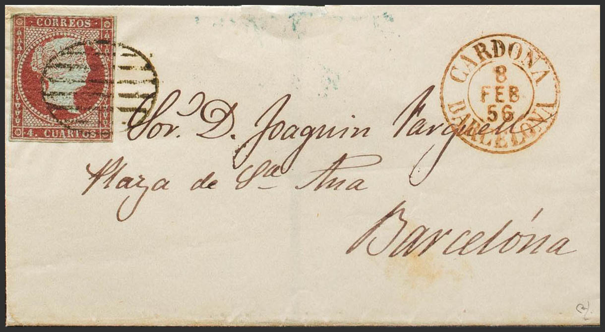 40. 1856. 4 red cuartos . CARDONA to BARCELONA. On the front dater CARDONA / BARCELONA (Type I). MAGNIFICENT. Ex-Blight.