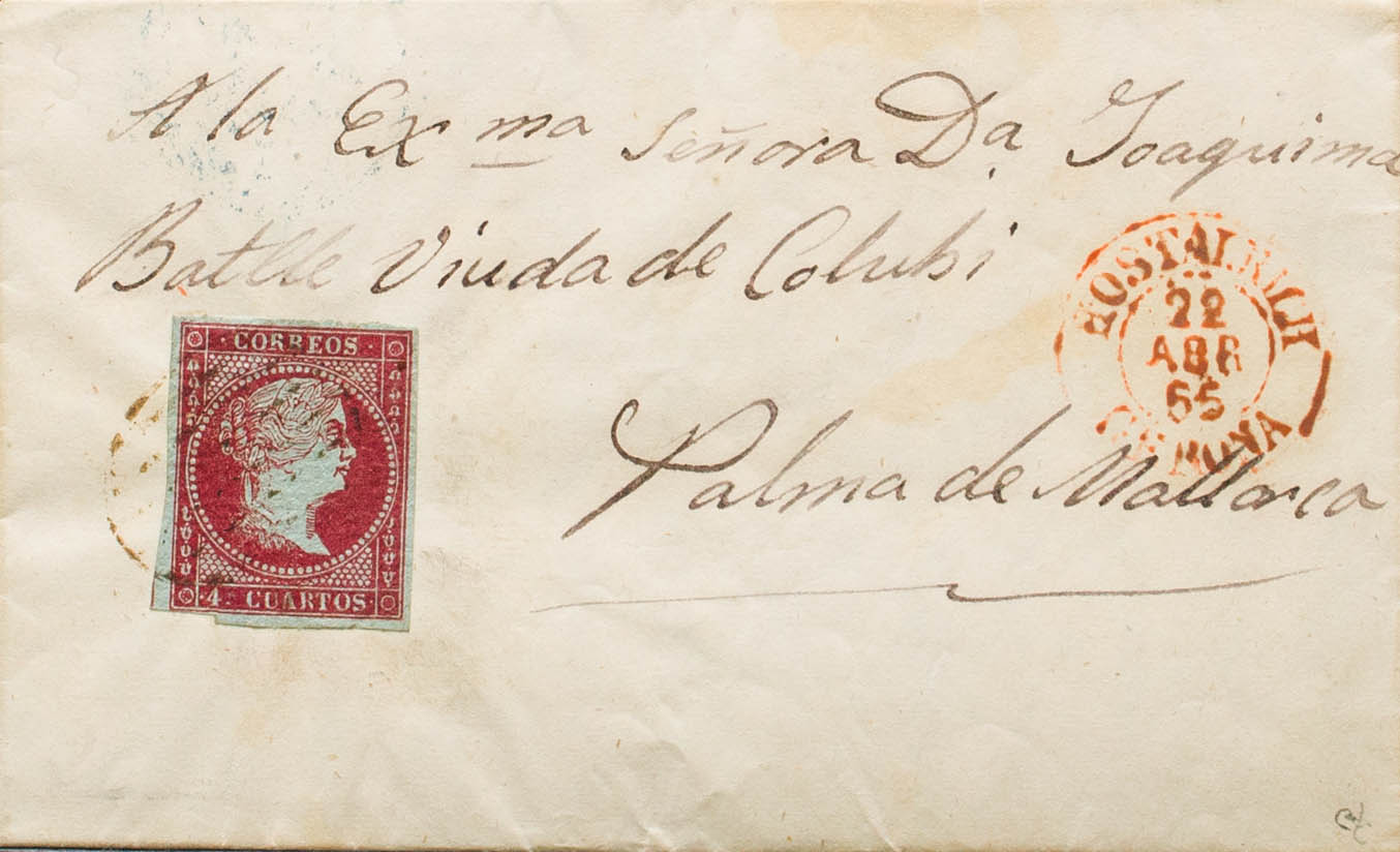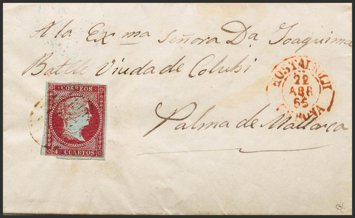 40. 1855. 4 carmine cuartos . GRIONS to PALMA DE MALLORCA. Postmark PARRILLA, in writing ink and on the front dater HOSTALRICH / GERONA (Type I), in red. MAGNIFICENT. Ex-Blight.
