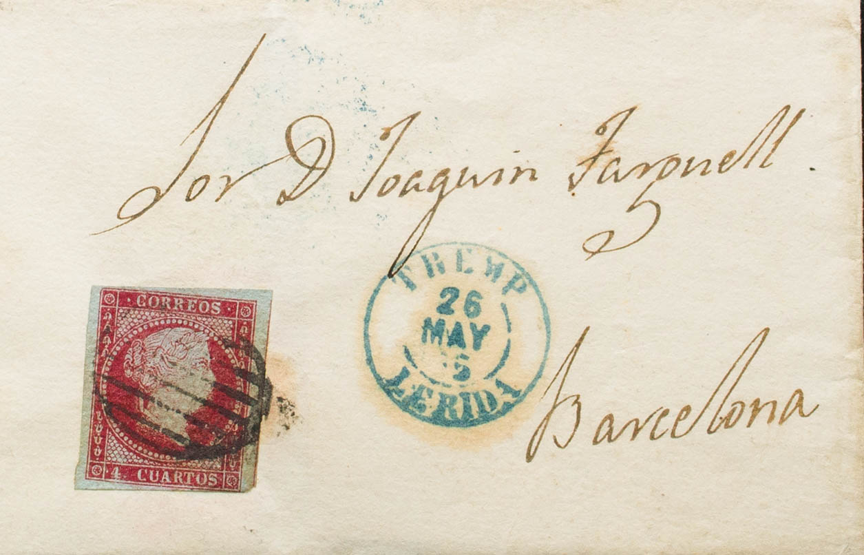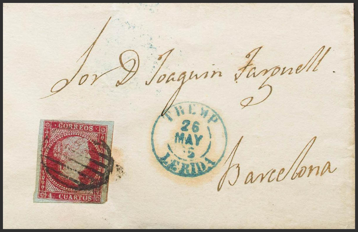 40. 1855. 4 carmine cuartos . TREMP to BARCELONA. On the front dater TREMP / LERIDA (Type I), in blue. MAGNIFICENT. Ex-Blight.