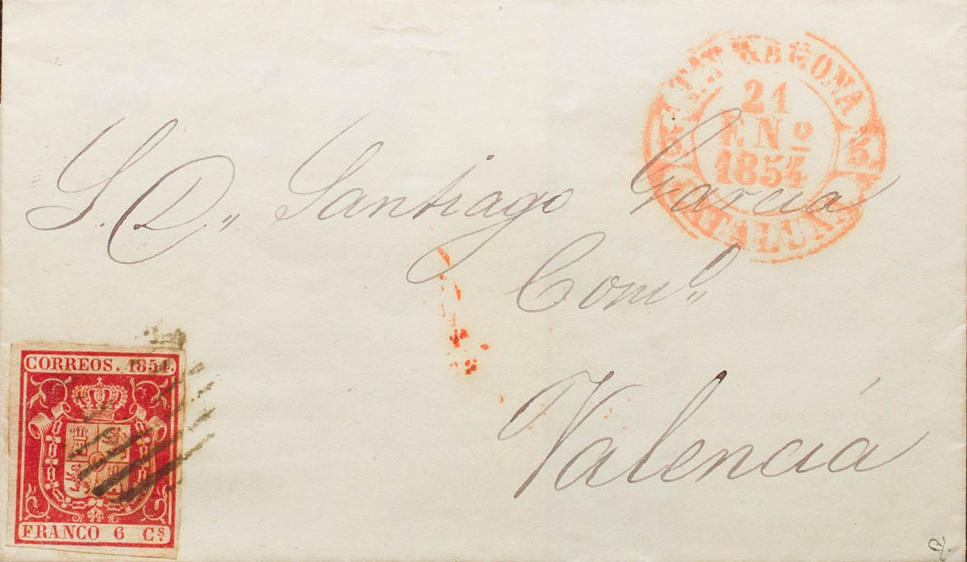 24. 1854. 6 carmine cuartos . TARRAGONA to VALENCIA. In the baeza front TARRAGONA / CATALONIA. MAGNIFICENT. Ex-Blight.