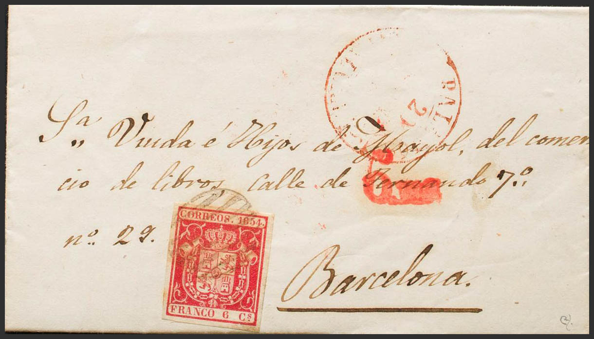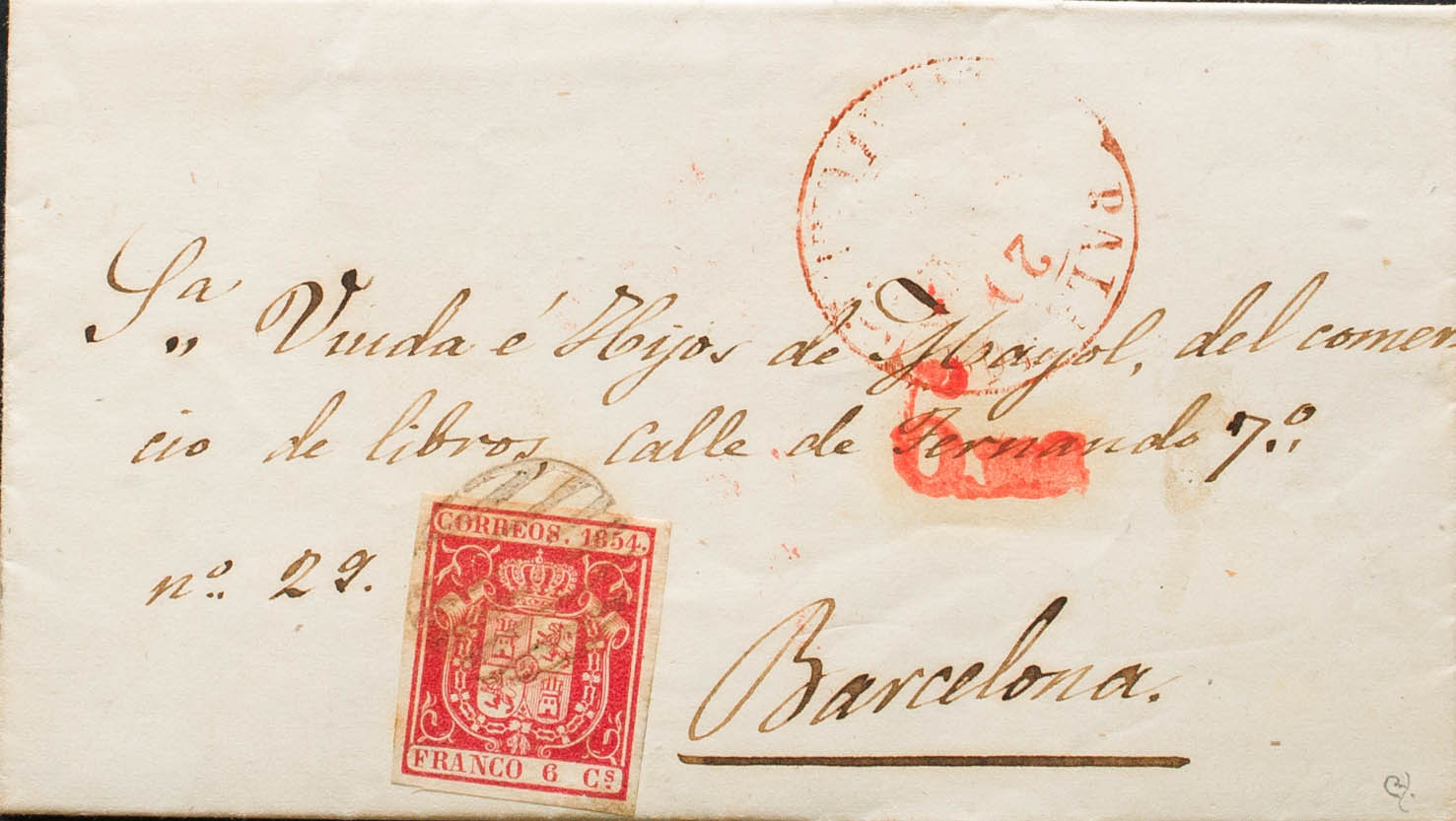 24. 1854. 6 carmine cuartos . PALAFRUGELL to BARCELONA. In the front baeza PALAMOS / CATALONIA. MAGNIFICENT AND RARE. Ex-Blight.