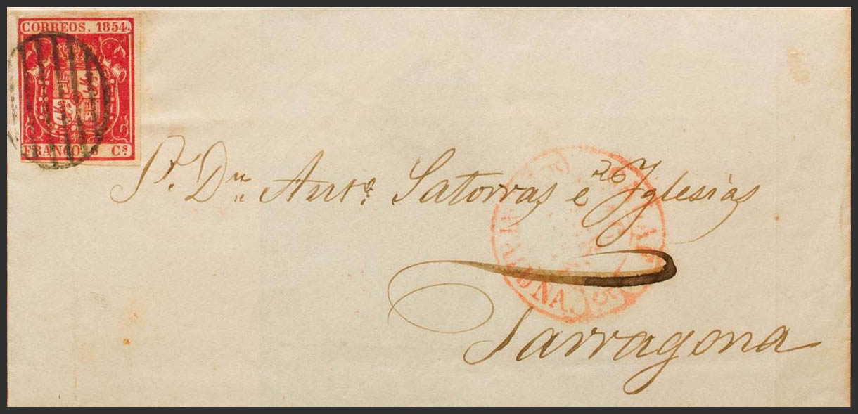 24. 1854. 6 carmine cuartos . CALAF to TARRAGONA. In the baeza front CALAF / CATALONIA. MAGNIFICENT. Ex-Blight.