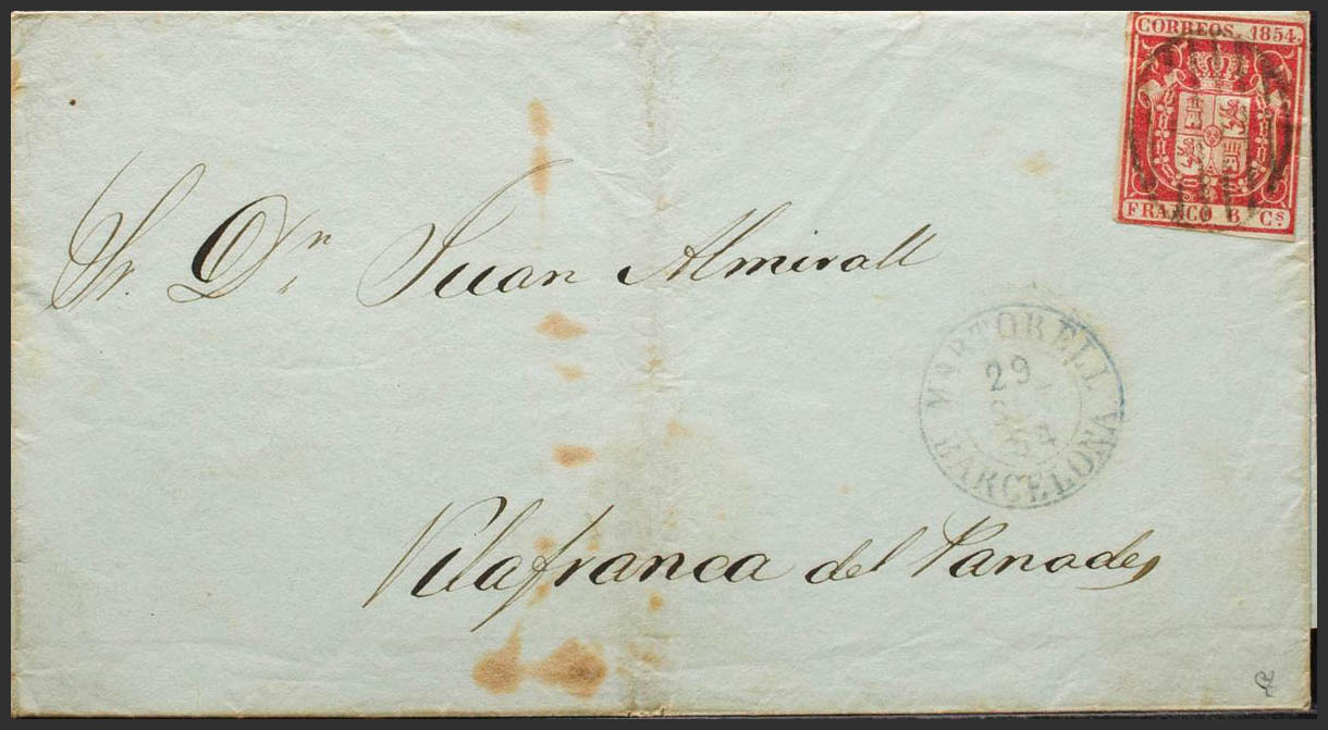 24. 1854. 6 carmine cuartos . MARTORELL to VILLAFRANCA DEL PENEDES. On the front date MARTORELL / BARCELONA (Type I), in blue. MAGNIFICENT. Ex-Blight.