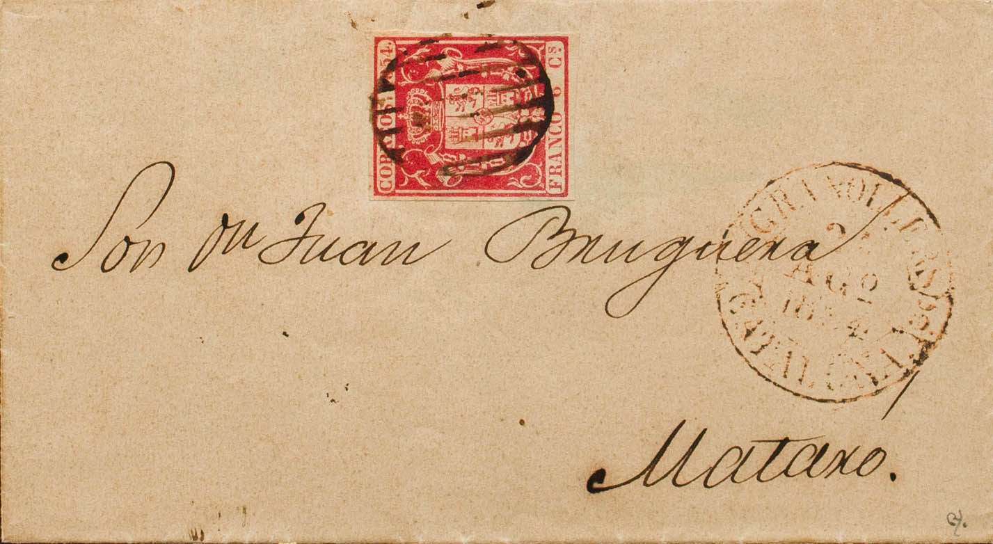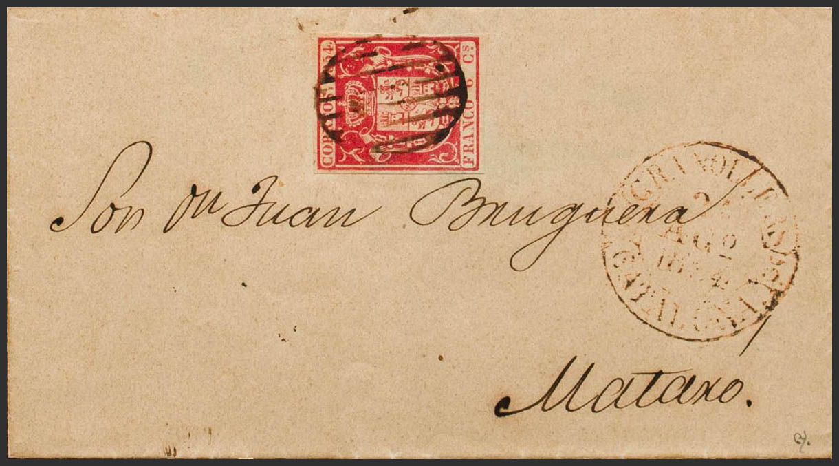 24. 1854. 6 carmine cuartos . GRANOLLERS to MATARO. On the front baeza GRANOLLERS / CATALUÑA, in rusty red. MAGNIFICENT AND RARE. Ex-Blight.