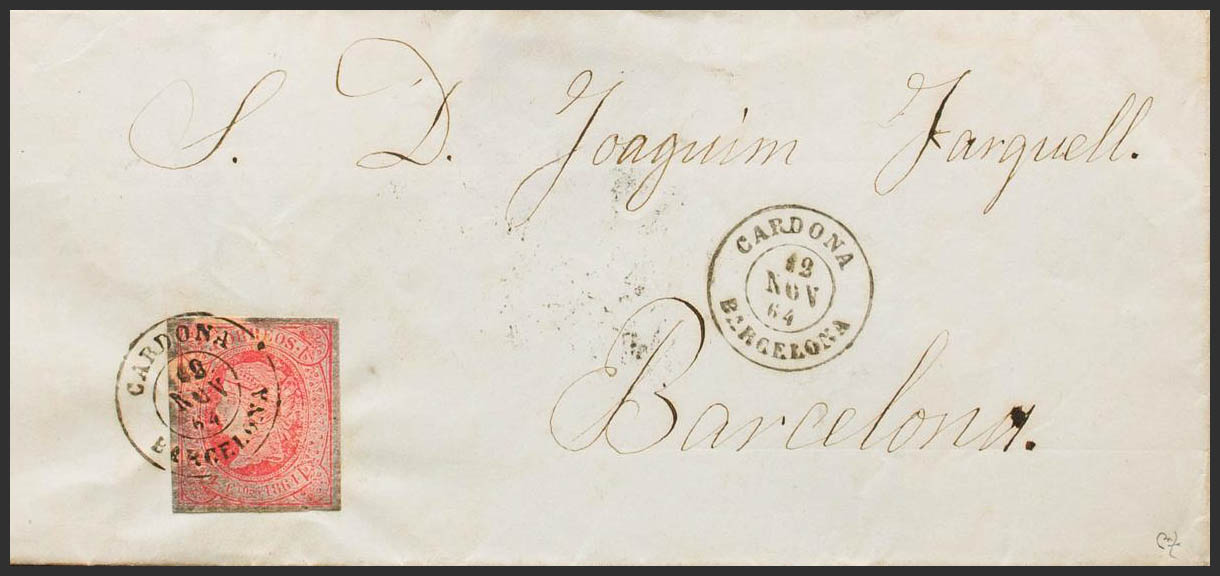 64. 1864. 4 red cuartos . CARDONA to BARCELONA. Postmark CARDONA / BARCELONA. MAGNIFICENT. Ex-Blight.