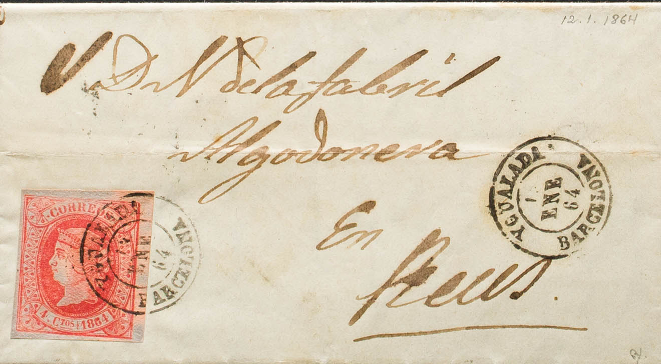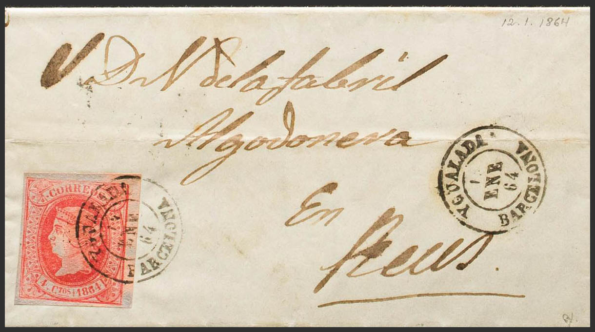 64. 1864. 4 red cuartos . EQUAL TO REUS. Postmark YGUALADA / BARCELONA. MAGNIFICENT. Ex-Blight.