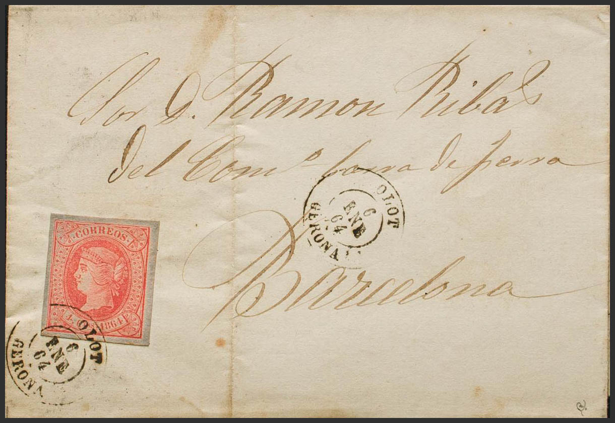 64. 1864. 4 red cuartos . OLOT to BARCELONA. Postmark OLOT / GERONA. MAGNIFICENT. Ex-Blight.
