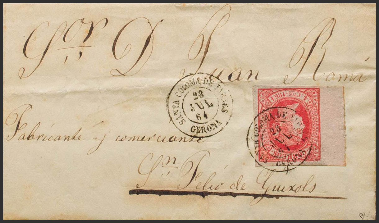 64. 1864. 4 red cuartos , leaf edge. SANTA COLOMA DE FARNES to SAN FELIU DE GUIXOLS. Postmark SANTA COLOMA DE FARNES / GERONA. MAGNIFICENT AND VERY RARE. Ex-Blight.