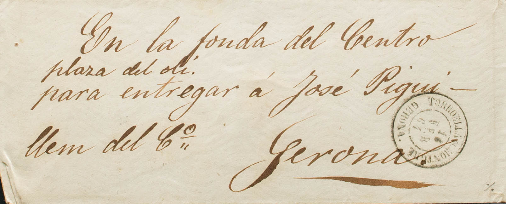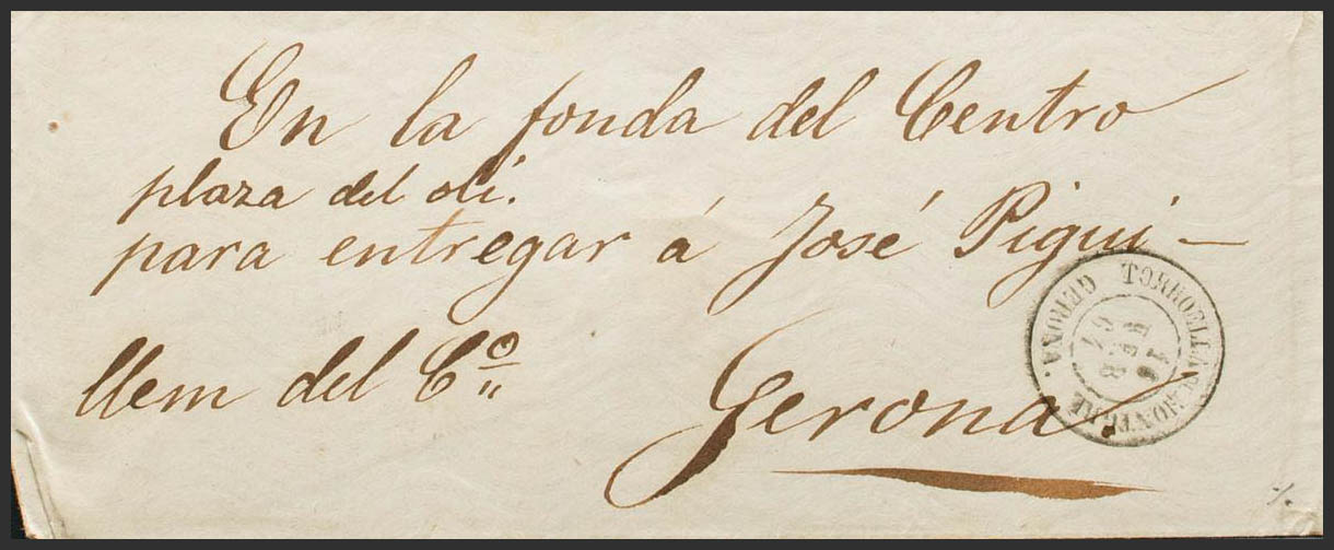 64. 1864. 4 red cuartos (used as closure on back). TORROELLA DE MONTGRI to GERONA. Postmark TORROELLA DE MONTGRI / GERONA. MAGNIFICENT AND RARE. Ex-Blight.