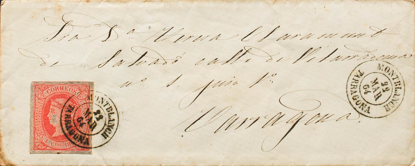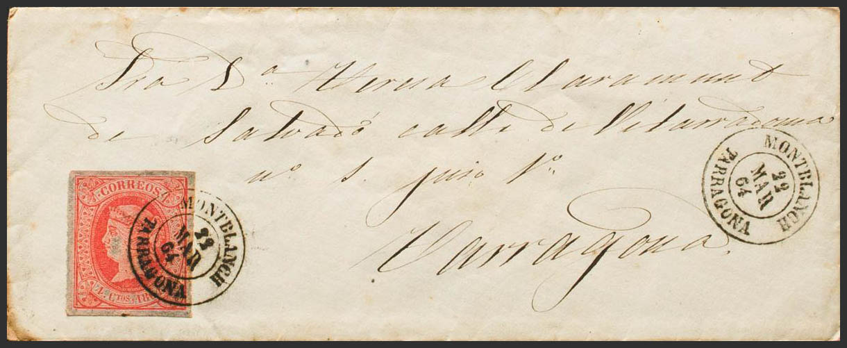64. 1864. 4 red cuartos . MONTBLANCH to TARRAGONA. Postmark MONTBLANCH / TARRAGONA. MAGNIFICENT AND RARE, FIRST DATES OF USE OF MECHANIZED ENVELOPES. Ex-Blight.