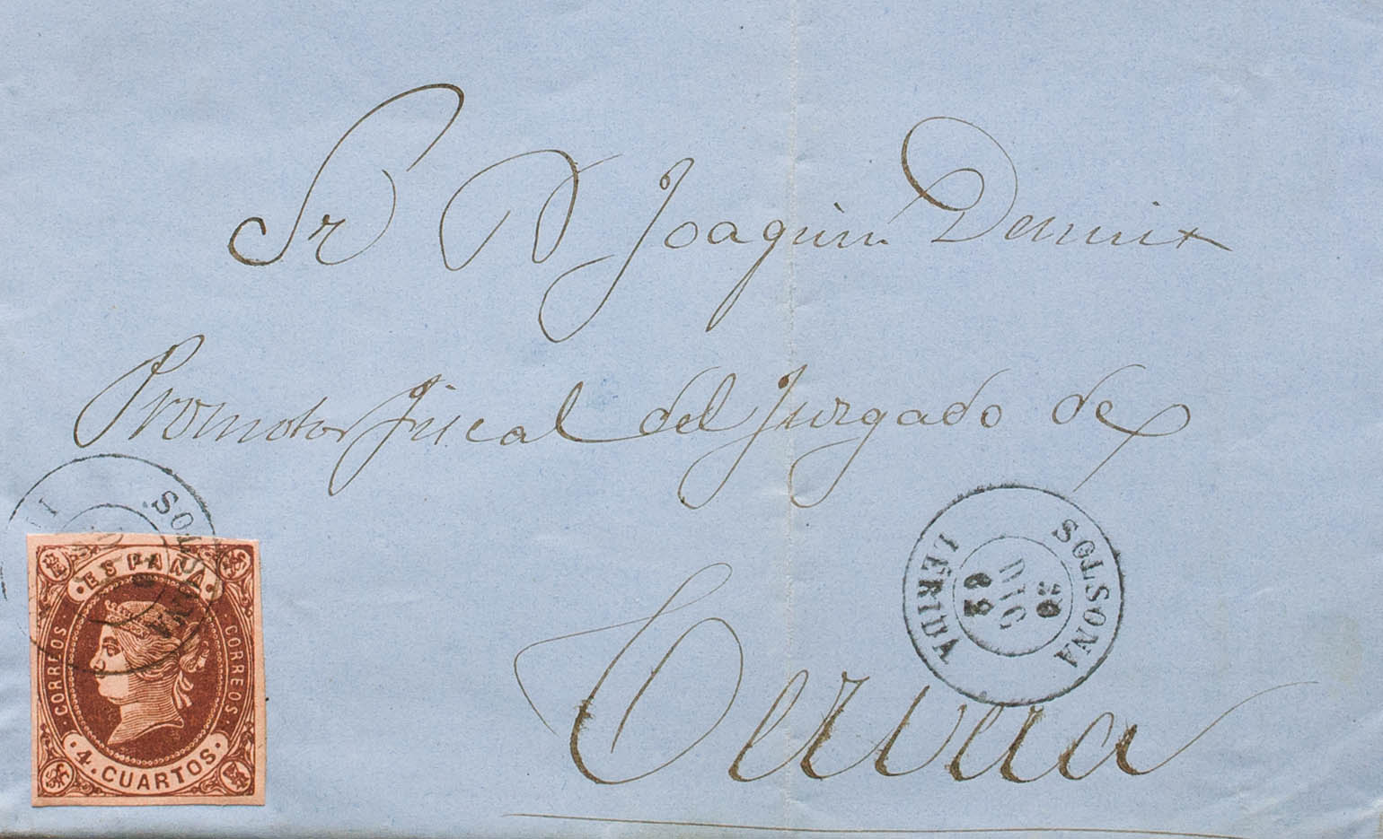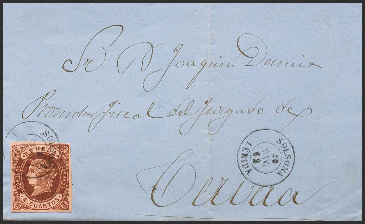 58. 1862. 4- cuartos chestnut. SOLSONA to CERVERA. Postmark SOLSONA / LERIDA. MAGNIFICENT AND RARE. Ex-Blight.