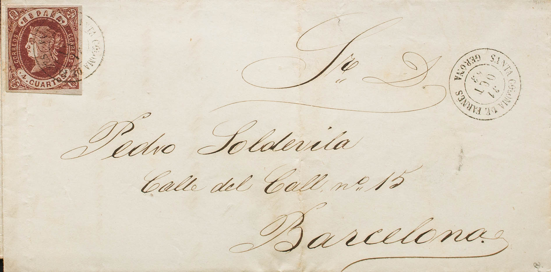 58. 1862. 4- cuartos chestnut. SANTA COLOMA DE FARNES to BARCELONA. Postmark SANTA COLOMA DE FARNES / GERONA. MAGNIFICENT AND VERY RARE. Ex-Blight.