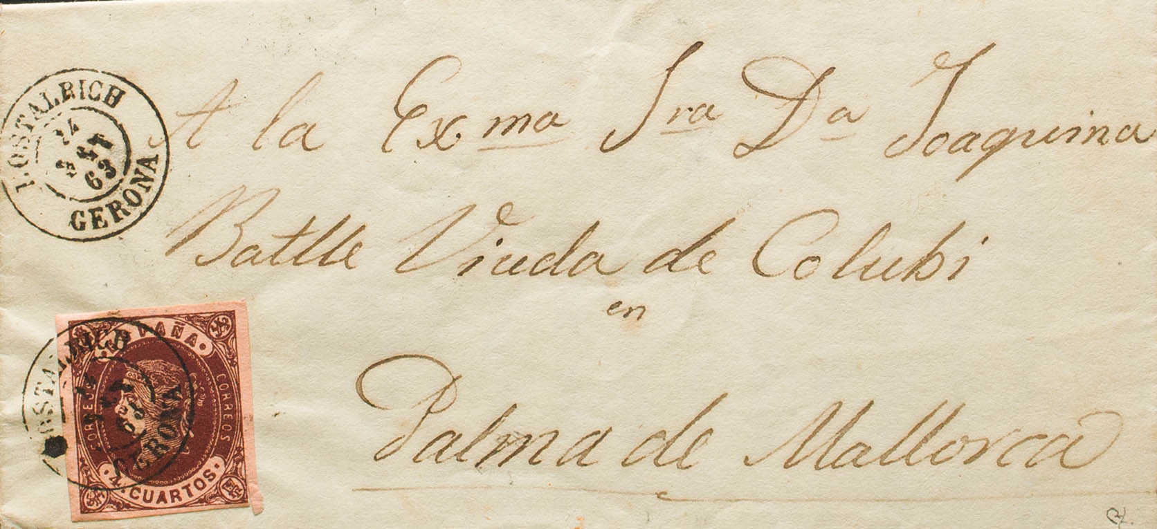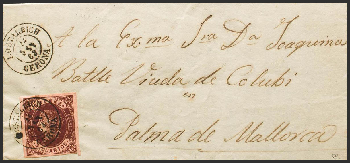 58. 1863. 4- cuartos chestnut. GRIONS to PALMA DE MALLORCA. Postmark HOSTALRICH / GERONA. MAGNIFICENT AND RARE. Ex-Blight.