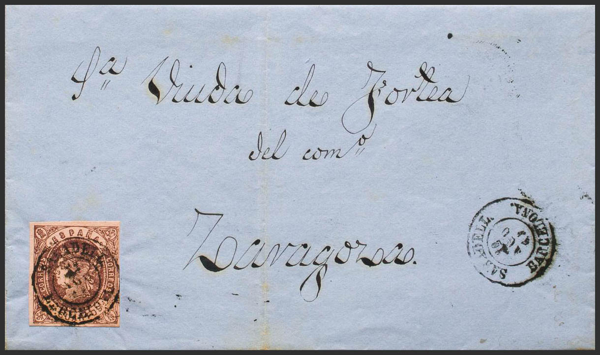 58. 1863. 4- cuartos chestnut. SABADELL to ZARAGOZA. Postmark SABADELL / BARCELONA. Ex-Blight.