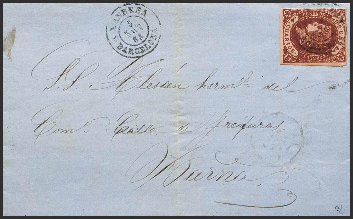 58. 1863. 4- cuartos chestnut. MANRESA to BARCELONA. Postmark MANRESA / BARCELONA. MAGNIFICENT. Ex-Blight.