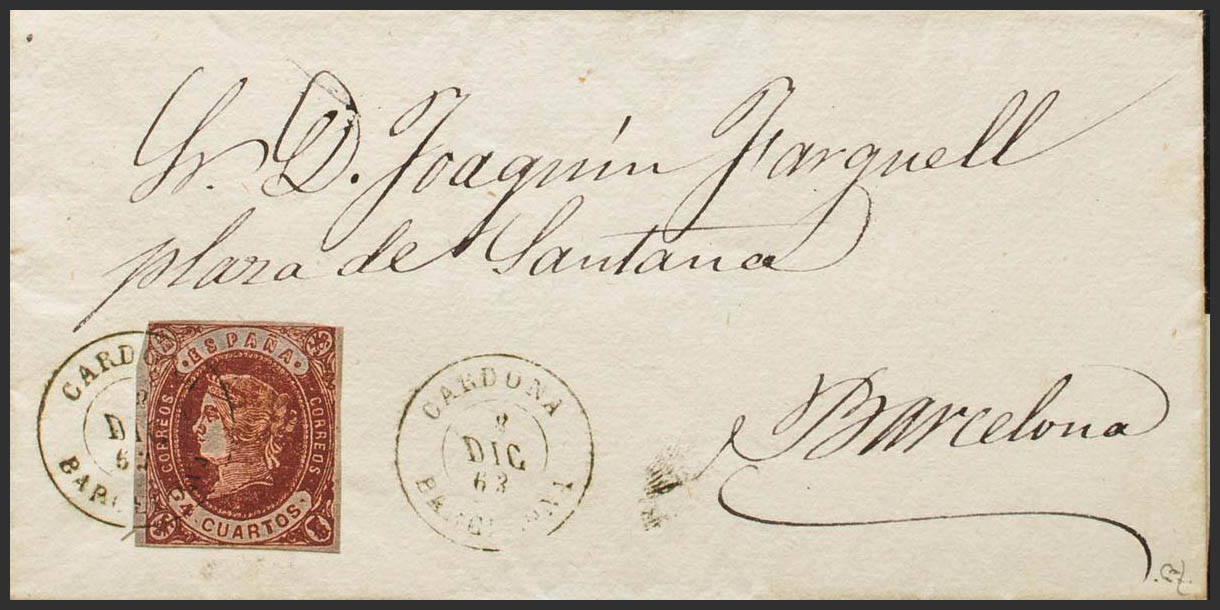 58. 1863. 4- cuartos chestnut. CARDONA to BARCELONA. Postmark CARDONA / BARCELONA. MAGNIFICENT AND RARE. Ex-Blight.