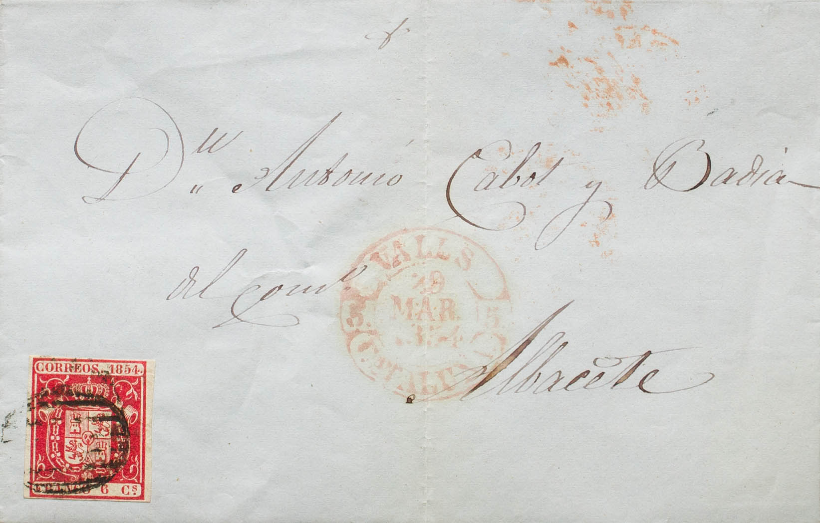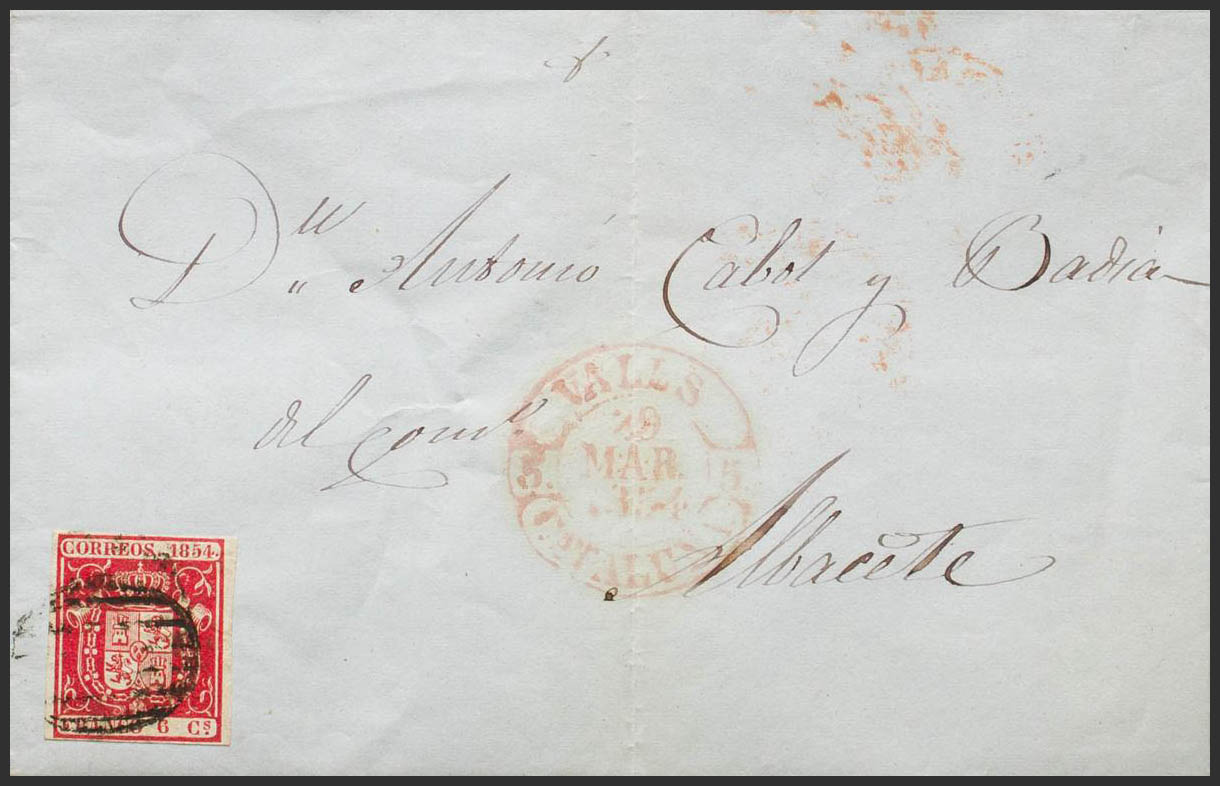 24. 1854. 4 carmine cuartos . VALLS to ALBACETE. In the front baeza VALLS / CATALONIA. MAGNIFICENT. Ex-Blight.